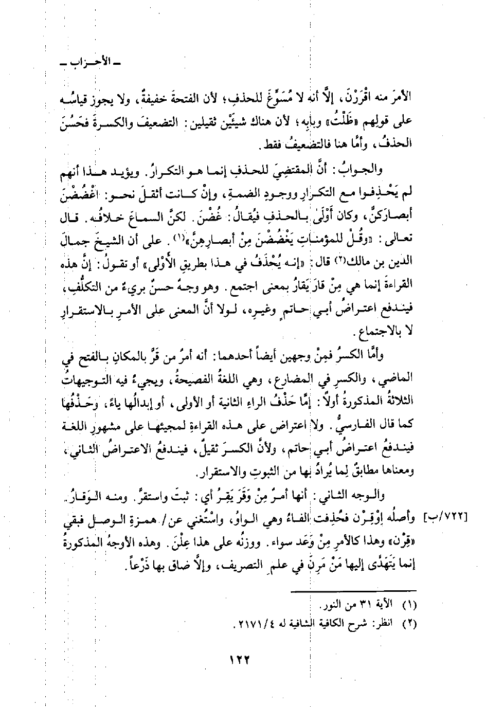 ويؤيد هذا أنهم لم يَحْذِفوا مع التكرارِ ووجودِ الضمةِ، وإنْ كانت أثقلَ نحو: اغْضُضْنَ أبصارَكنَّ، وكان أَوْلَى بالحذفِ فيُقالُ: غُضْنَ. لكنَّ السماعَ خلافُه. قال تعالى: {وَقُل لِّلْمُؤْمِنَاتِ يَغْضُضْنَ مِنْ أَبْصَارِهِنَّ} [النور: 31] . على أن الشيخَ جمالَ الدين بن مالك قال: «إنه يُحْذَفُ في هذا بطريقِ الأَوْلى» أو تقولُ: إنَّ هذه القراءةَ إنما هي مِنْ قارَ يَقارُ بمعنى اجتمع. وهو وجهٌ حسنٌ بريءٌ من التكلُّفِ، فيندفع اعتراضُ أبي حاتمٍ وغيرِه، لولا أنَّ المعنى على الأمرِ بالاستقرارِ لا بالاجتماع.