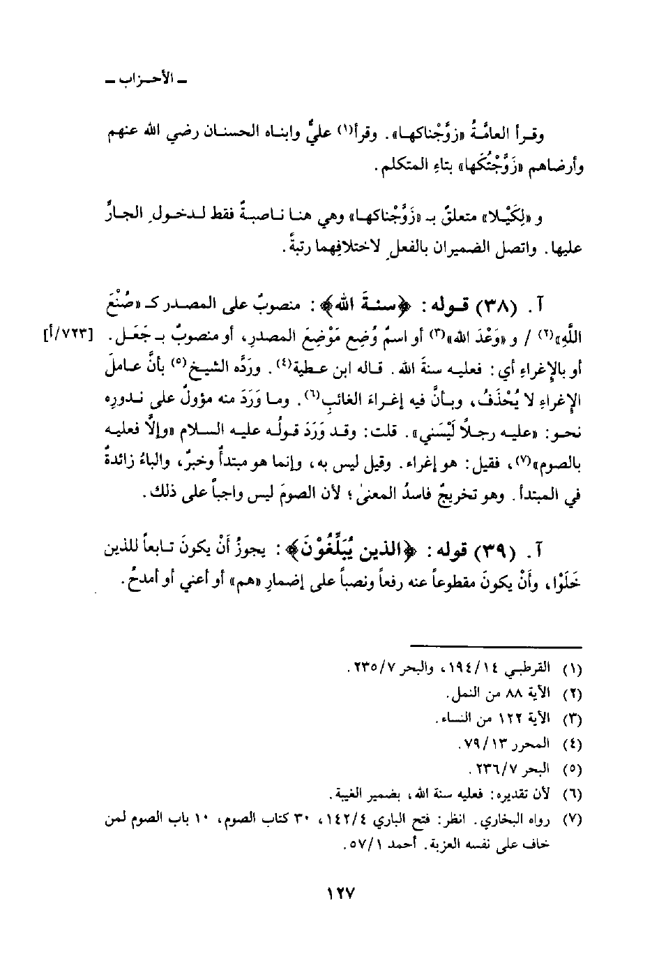 قوله: {سُنَّةَ الله} : منصوبٌ على المصدر ك {صُنْعَ الله} [النمل: 88] / و {وَعْدَ الله} [النساء: 122] أو اسمٌ وُضِع مَوْضِعَ المصدرِ، أو منصوبٌ ب جَعَل. أو بالإِغراءِ أي: فعليه سنةَ الله. قاله ابن عطية. ورَدَّه الشيخ بأنَّ عاملَ الإِغراءِ لا يُحْذَفُ، وبأنَّ فيه إغراءَ الغائبِ. وما وَرَدَ منه مؤولٌ على ندورِه نحو: «عليه رجلاً لَيْسَني» . قلت: وقد وَرَدَ قولُه عليه السلام «وإلاَّ فعليه بالصوم» ، فقيل: هو إغراء. وقيل ليس به، وإنما هو مبتدأٌ وخبرٌ، والباءُ زائدةٌ في المبتدأ. وهو تخريجٌ فاسدُ المعنى؛ لأن الصومَ ليس واجباً على ذلك.