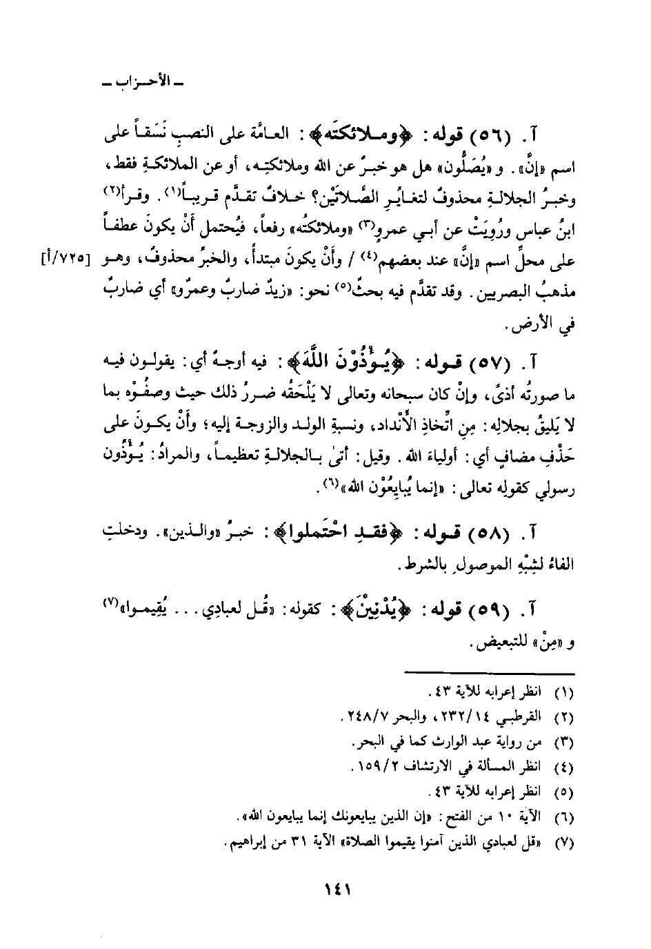 قوله: {وَمَلاَئِكَتَهُ} : العامَّة على النصبِ نَسَقاً على اسم «إنَّ» . و «يُصَلُّون» هل هو خبرٌ عن الله وملائكتِه، أو عن الملائكةِ فقط، وخبرُ الجلالةِ محذوفٌ لتغايُرِ الصَّلاتَيْن؟ خلافٌ تقدَّم قريباً. وقرأ ابنُ عباسٍ ورُوِيَتْ عن أبي عمروٍ «وملائكتُه» رفعاً، فيُحتمل أَنْ يكونَ عطفاً على محلِّ اسم «إنَّ» عند بعضهم/ وأَنْ يكونَ مبتدأً، والخبرُ محذوفٌ، وهو مذهبُ البصريين. وقد تقدَّم فيه بحثٌ نحو: «زيدٌ ضاربٌ وعمرٌو» أي ضاربٌ في الأرض.