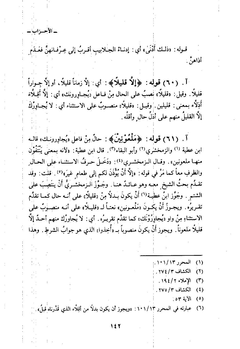 قوله: {إِلاَّ قَلِيلاً} : أي: إلاَّ زماناً قليلاً، أو إلاَّ جِواراً قليلاً. وقيل: «قليلاً» نصبٌ على الحال مِنْ فاعل «يُجاوِرونك» أي: إلاَّ أَقِلاَّءَ أَذِلاَّء بمعنى: قليلين. وقيل: «قليلاً» منصوبٌ على الاستثناء أي: لا يُجاوِرُكَ إلاَّ القليلُ منهم على أذلِّ حالٍ وأقلِّه.