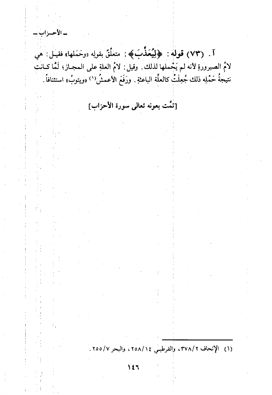 قوله: {لِّيُعَذِّبَ} : متعلِّقٌ بقولِه «وحَمَلها» فقيل: هي لامُ الصيرورةِ لأنه لم يَحْملها لذلك. وقيل: لامُ العلةِ على المجاز؛ لَمَّا كانت نتيجةُ حَمْلِه ذلك جُعِلَتْ كالعلَّة الباعثةِ. ورَفَعَ الأعمشُ «ويتوبُ» استئنافاً.