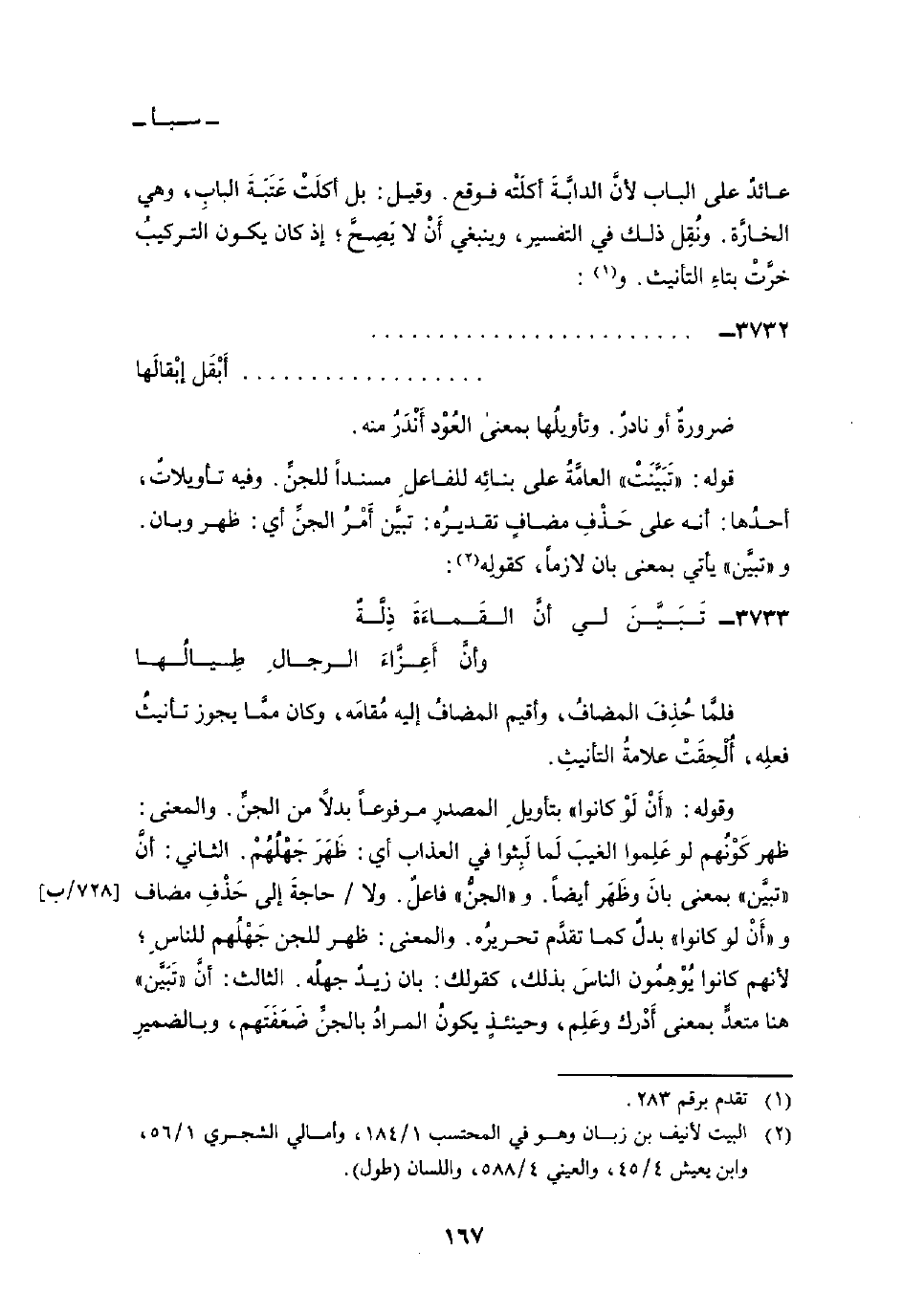 الثالث: أنَّ «تَبَيَّن» هنا متعدٍّ بمعنى أَدْرك وعَلِم، وحينئذٍ يكون المرادُ بالجنِّ ضَعَفَتَهم، وبالضميرِ