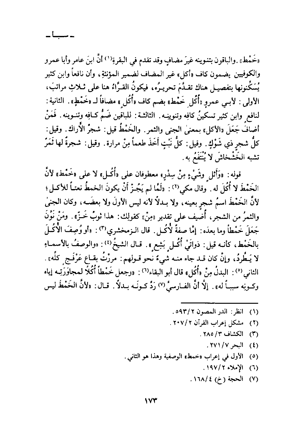 خَمْط «. والباقون بتنوينه غيرَ مضافٍ وقد تقدم في البقرةِ أنَّ ابنَ عامرٍ وأبا عمرو والكوفيين يضمون كاف» أكل «غير المضاف لضمير المؤنثةِ، وأن نافعاً وابن كثير يُسَكِّنونها بتفصيل هناك تقدَّمَ تحريرُه، فيكونُ القرَّاءُ هنا على ثلاثِ مراتبَ، الأولى: لأبي عمروٍ» أُكُلِ خَمْط «بضم كاف» أُكُلٍ «مضافاً ل» خَمْطٍ «. الثانية: لنافعٍ وابن كثير تسكينُ كافِه وتنوينِه. الثالثة: للباقين ضَمُّ كافِه وتنوينه. فَمَنْ أضافَ جَعَلَ» الأكل «بمعنى الجنى والثمر. والخَمْطُ قيل: شجرُ الأَراك. وقيل: كلُّ شجرٍ ذي شَوْكٍ. وقيل: كلُّ نَبْتٍ أَخَذَ طعماً مِنْ مرارة. وقيل: شجرةٌ لها ثَمَرٌ تشبه الخَشْخاشَ لا يُنْتَفَعُ به.