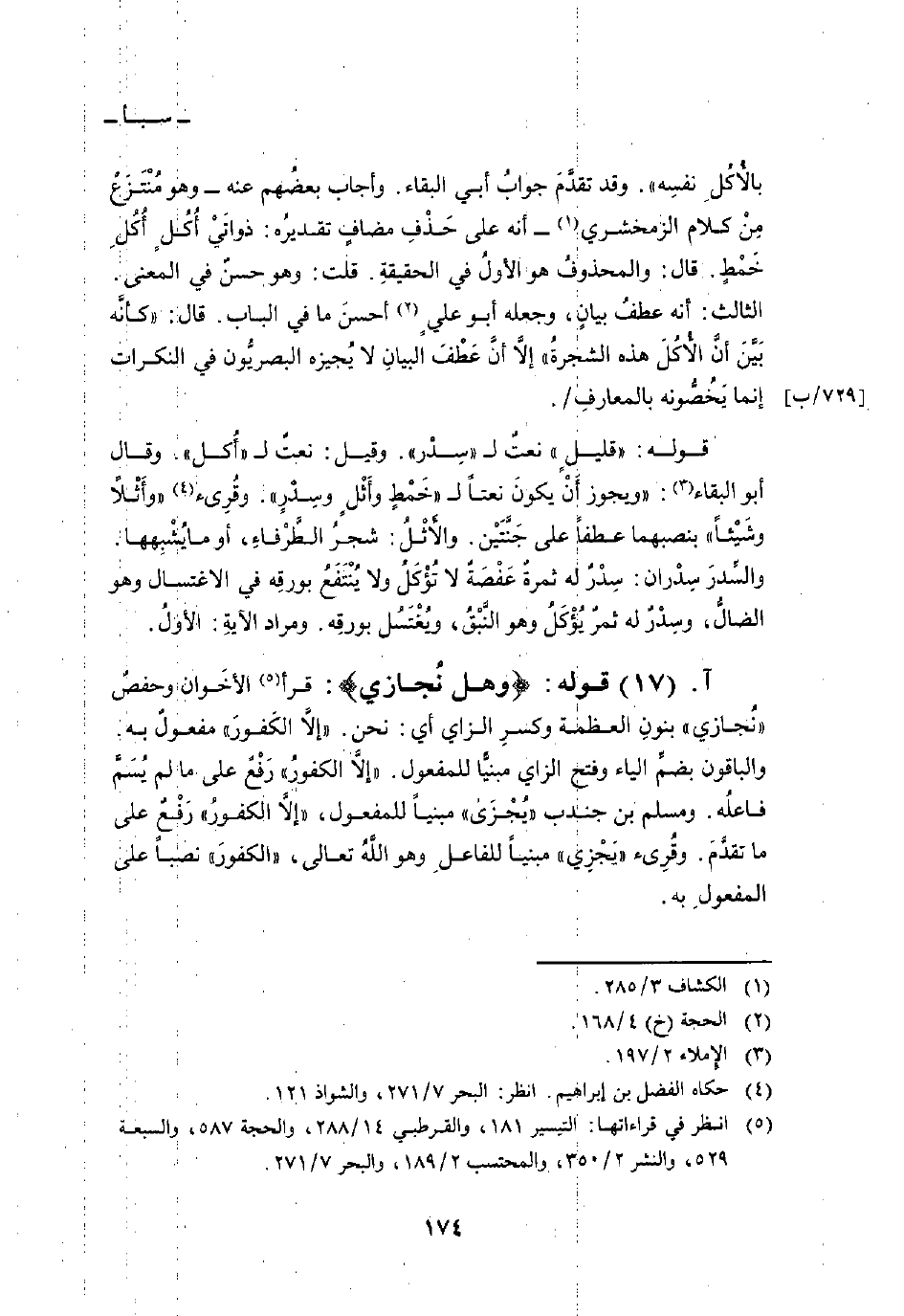قوله: «قليلٍ» نعتٌ ل «سِدْر» . وقيل: نعتٌ ل «أُكل» . وقال أبو البقاء: «ويجوز أَنْ يكونَ نعتاً ل» خَمْطٍ وأَثْلٍ وسِدْرٍ «. وقُرِئ» وأَثْلاً وشَيْئاً «بنصبهما عطفاً على جَنَّتَيْن. والأَثْلُ: شجرُ الطَّرْفاءِ، أو ما يُشْبِهها. والسِّدرَ سِدْران: سِدْرٌ له ثمرةٌ عَفْصَةٌ لا تُؤْكَلُ ولا يُنْتَفَعُ بورقِه في الاغتسال وهو الضالُّ، وسِدْرٌ له ثمرٌ يُؤْكَلُ وهو النَّبْقُ، ويُغْتَسُل بورقِه. ومراد الآيةِ: الأولُ.