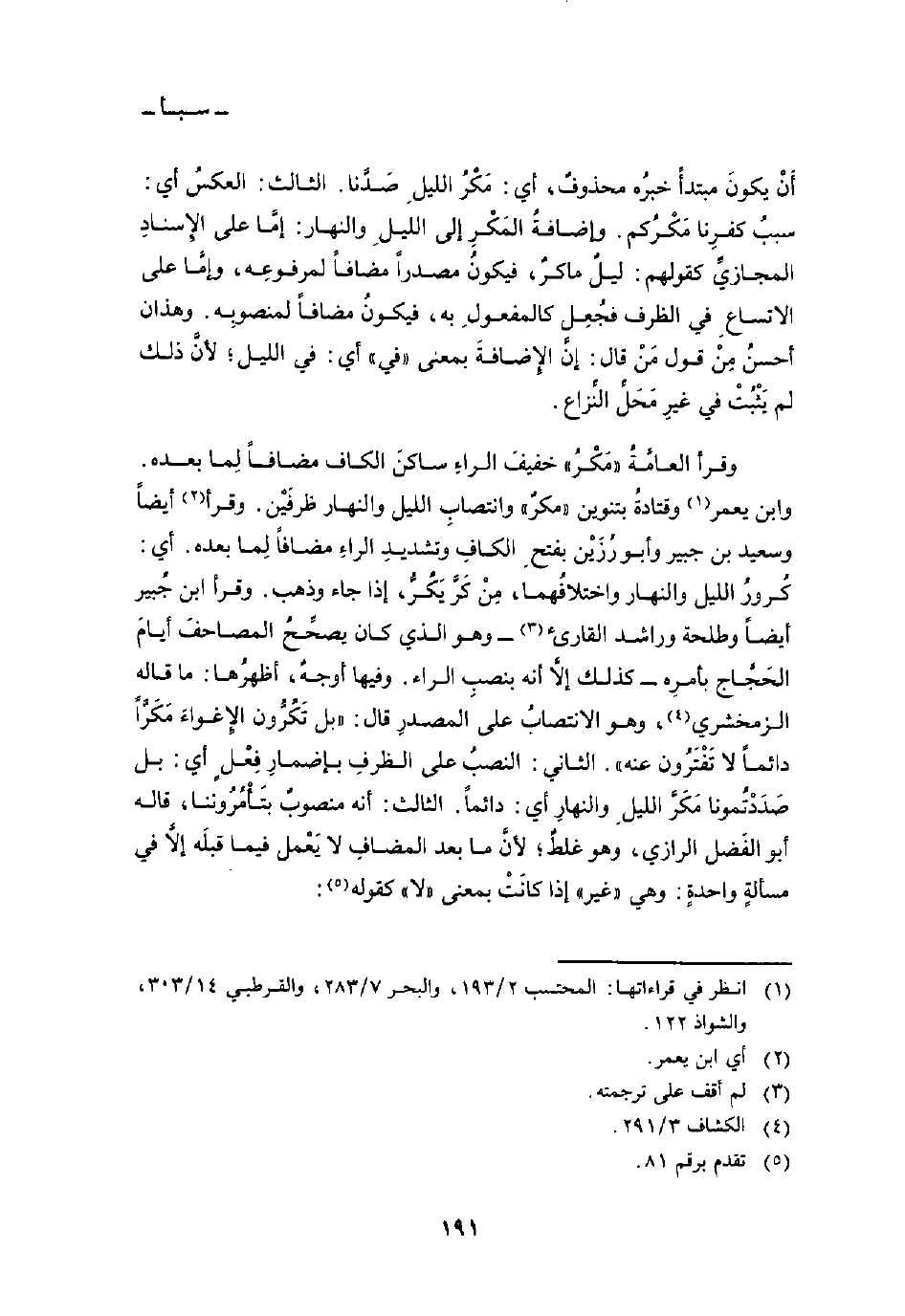 وقرأ العامَّةُ «مَكْرُ» خفيفَ الراءِ ساكنَ الكاف مضافاً لِما بعده. وابن يعمر وقتادةُ بتنوين «مكرٌ» وانتصابِ الليل والنهار ظرفَيْن. وقرأ أيضاً وسعيد بن جبير وأبو رُزَيْن بفتحِ الكافِ وتشديدِ الراء مضافاً لِما بعده. أي: كُرورُ الليل والنهار واختلافُهما، مِنْ كَرَّ يَكُرُّ، إذا جاء وذهب. وقرأ ابن جُبير أيضاً وطلحة وراشد القارئ - وهو الذي كان يصحِّحُ المصاحفَ أيامَ الحَجَّاج بأمرِه - كذلك إلاَّ أنه بنصبِ الراء. وفيها أوجهٌ، أظهرُها: ما قاله الزمخشري، وهو الانتصابُ على المصدرِ قال: «بل تَكُرُّون الإِغواءَ مَكَرَّاً دائماً لا تَفْتَرُون عنه» . الثاني: النصبُ على الظرفِ بإضمارِ فِعْلٍ أي: بل صَدَدْتُمونا مَكَرَّ الليلِ والنهارِ أي: دائماً. الثالث: أنه منصوبٌ بتَأْمُرُوننا، قاله أبو الفَضل الرازي، وهو غلطٌ؛ لأنَّ ما بعد المضافِ لا يَعْمل فيما قبلَه إلاَّ في مسألةٍ واحدةٍ: وهي «غير» إذا كانَتْ بمعنى «لا» كقوله: