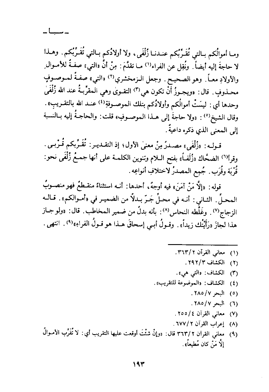 وما أموالُكم بالتي تُقَرِّبُكم عندنا زُلْفَى، ولا أولادُكم بالتي تُقَرِّبُكم. وهذا لا حاجةَ إليه أيضاً. ونُقِل عن الفراء ما تقدَّمَ: مِنْ أنَّ «التي» صفةٌ للأموالِ والأولادِ معاً. وهو الصحيح. وجعل الزمخشري «التي» صفةً لموصوفٍ محذوفٍ. قال: «ويجوزُ أَنْ تكون هي التقوى وهي المقرِّبةُ عند الله زُلْفَى وحدها أي: ليسَتْ أموالُكم وأولادُكم بتلك الموصوفةِ عند الله بالتقريبِ» . وقال الشيخ: «ولا حاجةَ إلى هذا الموصوفِ» قلت: والحاجةُ إليه بالنسبة إلى المعنى الذي ذكره داعيةٌ.