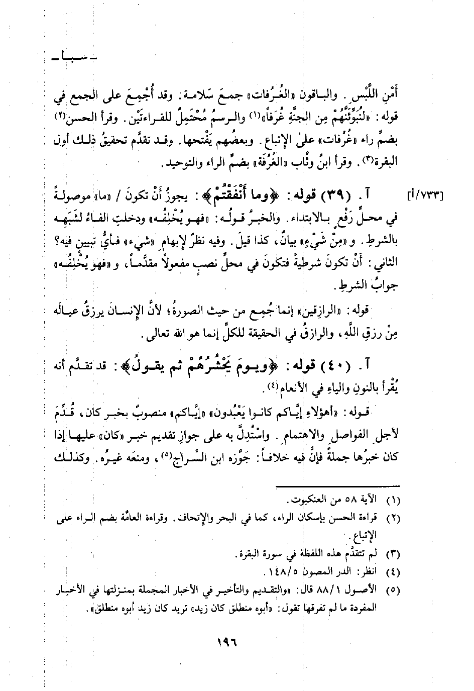 قوله: {وَمَآ أَنفَقْتُمْ} : يجوزُ أَنْ تكونَ/ «ما» موصولةً في محلِّ رَفْعٍ بالابتداء. والخبرُ قولُه: «فهو يُخْلِفُه» ودخلتِ الفاءُ لشَبَهِه بالشرطِ. و «مِنْ شَيْءٍ» بيانٌ، كذا قيلَ. وفيه نظرٌ لإِبهامِ «شيء» فأيُّ تبيينٍ فيه؟ الثاني: أَنْ تكونَ شرطيةً فتكونَ في محلِّ نصبٍ مفعولاً مقدَّماً، و «فهو يُخْلِفُه» جوابُ الشرطِ.
