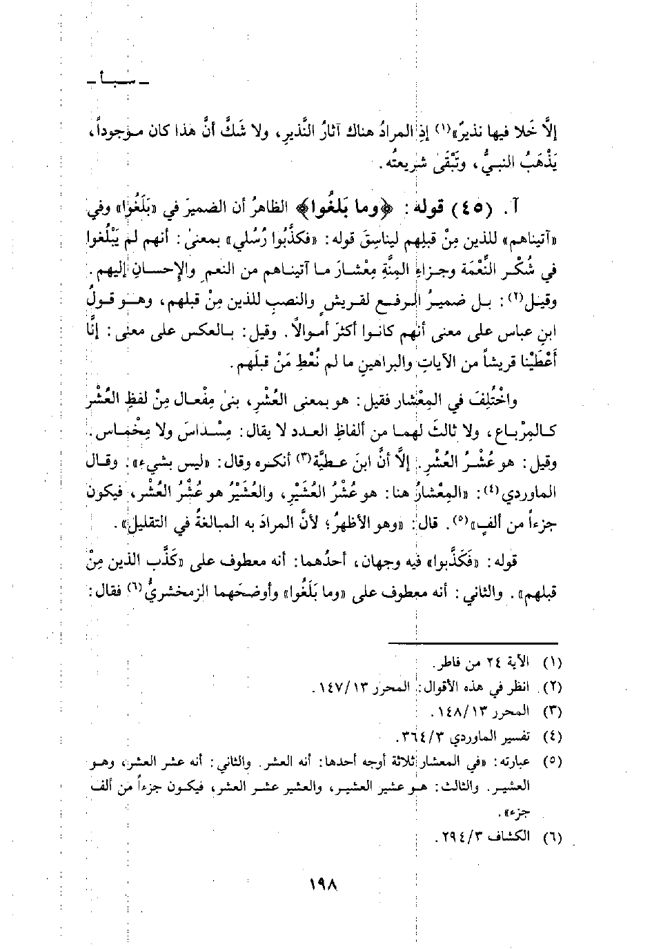 قوله: {وَمَا بَلَغُواْ} الظاهرُ أن الضميرُ في «بَلَغُوا» وفي «آتيناهم» للذين مِنْ قبلهم ليناسِقَ قوله: «فكذَّبُوا رُسُلي» بمعنى: أنهم لم يَبْلُغوا في شُكْر النِّعْمَة وجزاءِ المِنَّةِ مِعْشارَ ما آتيناهم من النعمِ والإِحسانِ إليهم. وقيل: بل ضميرُ الرفع لقريشٍ والنصبِ للذين مِنْ قبلهم، وهو قولُ ابنِ عباس على معنى أنهم كانوا أكثرَ أموالاً. وقيل: بالعكس على معنى: إنَّا أَعْطَيْنا قريشاً من الآياتِ والبراهينِ ما لم نُعْطِ مَنْ قبلَهم.
