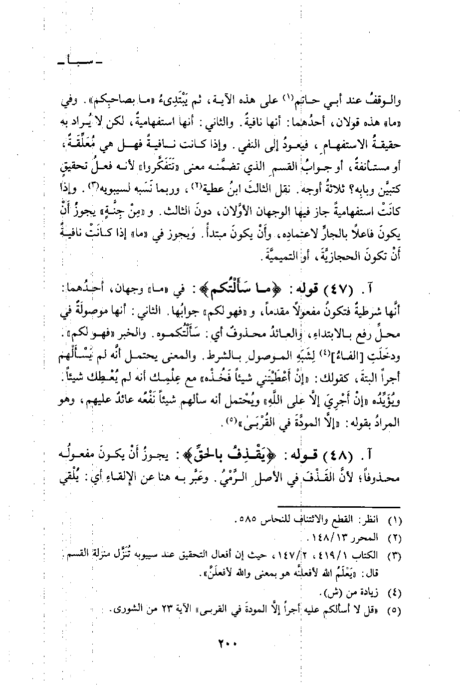 قوله: {مَا سَأَلْتُكُم} : في «ما» وجهان، أحدُهما: أنَّها شرطيةٌ فتكونُ مفعولاً مقدماً، و «فهو لكم» جوابُها. الثاني: أنها موصولَةٌ في محلِّ رفع بالابتداءِ، والعائدُ محذوفٌ أي: سَأَلْتُكموه. والخبر «فهو لكم» . ودخَلَتِ [الفاءُ] لِشَبَهِ الموصولِ بالشرط. والمعنى يحتمل أنَّه لم يَسْأَلْهم أجراً البتةَ، كقولك: «إنْ أَعْطَيْتَني شيئاً فَخُذْه» مع عِلْمِك أنه لم يُعْطِك شيئاً. ويُؤَيِّدُه {إِنْ أَجْرِيَ إِلاَّ عَلَى الله} ويُحْتمل أنه سألهم شيئاً نَفْعُه عائدٌ عليهم، وهو المرادُ بقوله: {إِلاَّ المودة فِي القربى} [الشورى: 23] .