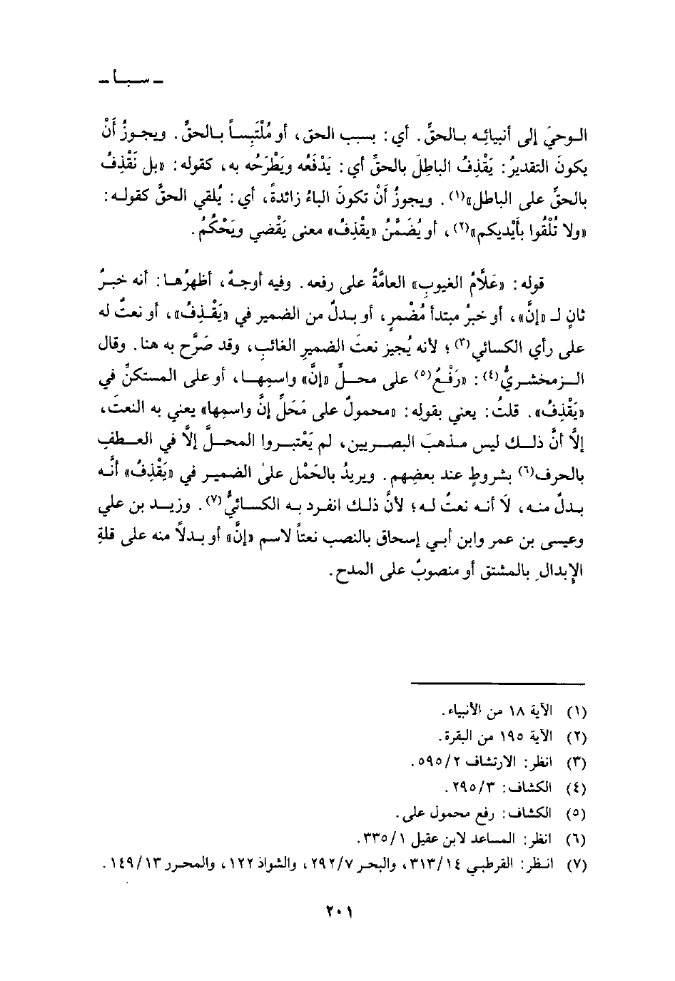 الوحيَ إلى أنبيائِه بالحقِّ. أي: بسبب الحق، أو مُلْتَبِساً بالحقِّ. ويجوزُ أَنْ يكونَ التقديرُ: يَقْذِفُ الباطِلَ بالحقِّ أي: يَدْفَعُه ويَطْرَحُه به، كقوله: {بَلْ نَقْذِفُ بالحق عَلَى الباطل} [الأنبياء: 18] . ويجوزُ أَنْ تكونَ الباءُ زائدةً، أي: يُلقي الحقَّ كقوله: {وَلاَ تُلْقُواْ بِأَيْدِيكُمْ} [البقرة: 195] ، أو يُضَمَّنُ «يقْذِفُ» معنى يَقْضي ويَحْكُمُ.