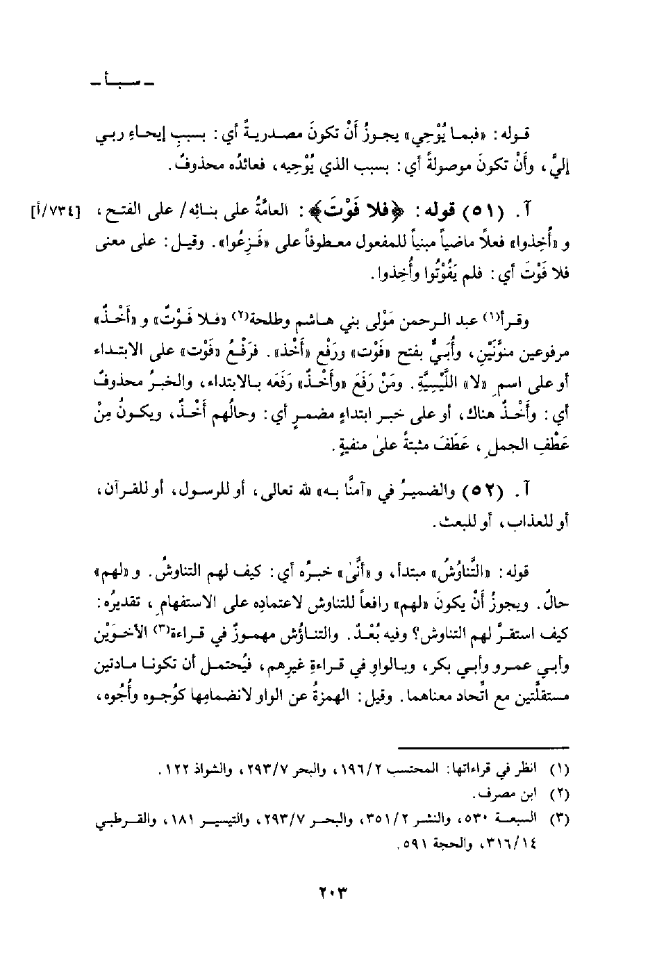 وقرأ عبد الرحمن مَوْلى بني هاشم وطلحة «فلا فَوْتٌ» و «أَخْذٌ» مرفوعين منوَّنَيْنِ، وأُبَيٌّ بفتح «فَوْت» ورَفْع «أَخْذ» . فرَفْعُ «فَوْت» على الابتداء أو على اسمِ «لا» اللَّيْسِيَّةِ. ومَنْ رَفَعَ «وأَخْذٌ» رَفَعَه بالابتداء، والخبرُ محذوفٌ أي: وأَخْذٌ هناك، أو على خبر ابتداءٍ مضمرٍ أي: وحالُهم أَخْذٌ، ويكونُ مِنْ عَطْفِ الجملِ، عَطَفَ مثبتةً على منفيةٍ.