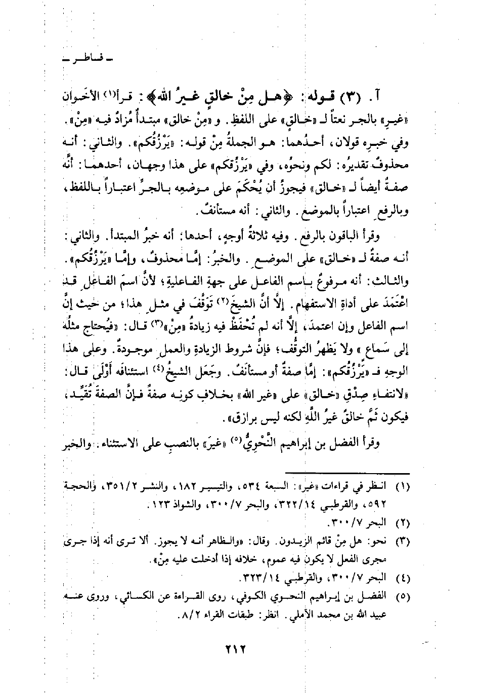 وقرأ الباقون بالرفع. وفيه ثلاثةُ أوجهٍ، أحدها: أنه خبرُ المبتدأ. والثاني: أنه صفةٌ ل «خالق» على الموضعِ. والخبرُ: إمَّا محذوفٌ، وإمَّا «يَرْزُقُكم» . والثالث: أنه مرفوعٌ باسم الفاعل على جهةِ الفاعليةِ؛ لأنَّ اسمَ الفاعلِ قد اعْتَمَدَ على أداةِ الاستفهام. إلاَّ أنَّ الشيخَ تَوَقَّفَ في مثلِ هذا؛ من حيث إنَّ اسم الفاعل وإن اعتمدَ، إلاَّ أنه لم تُحْفَظْ فيه زيادةُ «مِنْ» قال: «فيُحتاج مثلُه إلى سَماعٍ» ولا يَظهرُ التوقُّف؛ فإنَّ شروط الزيادةِ والعملِ موجودةٌ. وعلى هذا الوجهِ ف «يَرْزُقُكم» : إمَّا صفةٌ أو مستأنَفٌ. وجَعَل الشيخُ استئنافَه أَوْلَى قال: «لانتفاءِ صِدْقِ» خالق «على» غير الله «بخلافِ كونِه صفةً فإنَّ الصفةَ تُقَيِّد، فيكون ثَمَّ خالقٌ غيرُ اللَّهِ لكنه ليس برازق» .