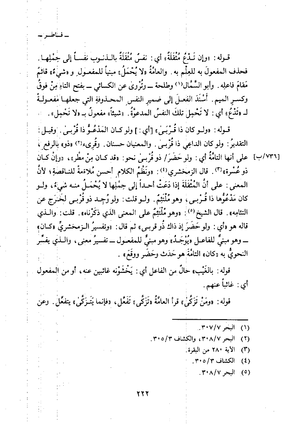 قوله: {وَلَوْ كَانَ ذَا قربى} [أي:] ولو كان المَدْعُوُّ ذا قُرْبى. وقيل: التقديرُ: ولو كان الداعِي ذا قُرْبى. والمعنيان حسنان. وقُرِئ «ذو» بالرفعِ، على أنها التامَّةُ أي: ولو حَضَرَ/ ذو قُرْبى نحو: «قد كان مِنْ مطْر» ، {وَإِن كَانَ ذُو عُسْرَةٍ} [البقرة: 280] . قال الزمخشري: «ونَظْمُ الكلامِ أحسن ملاءَمةً للناقصةِ؛ لأنَّ المعنى: على أنَّ المُثْقَلَةَ إذا دَعَتْ أحداً إلى حِمْلِها لا يُحْمَلُ منه شيءٌ، ولو كان مَدْعُوُّها ذا قُرْبى، وهو مُلْتَئِمٌ. ولو قلت: ولو وُجِد ذو قُرْبى لخَرَج عن التئامِه» . قال الشيخ: «وهو ملْتَئِمٌ على المعنى الذي ذكَرْناه» . قلت: والذي قاله هو «أي: ولو حَضَرَ إذ ذاك ذُو قربى» ثم قال: «وتفسيرُ الزمخشريِّ» كان «- وهو مبنيٌّ للفاعل» يُوْجَدُ «وهو مبنيٌّ للمفعول - تفسيرُ معنى، والذي يفسِّر النحويُّ به» كان «التامَّةَ هو حَدَث وحَضَر ووقَعَ» .