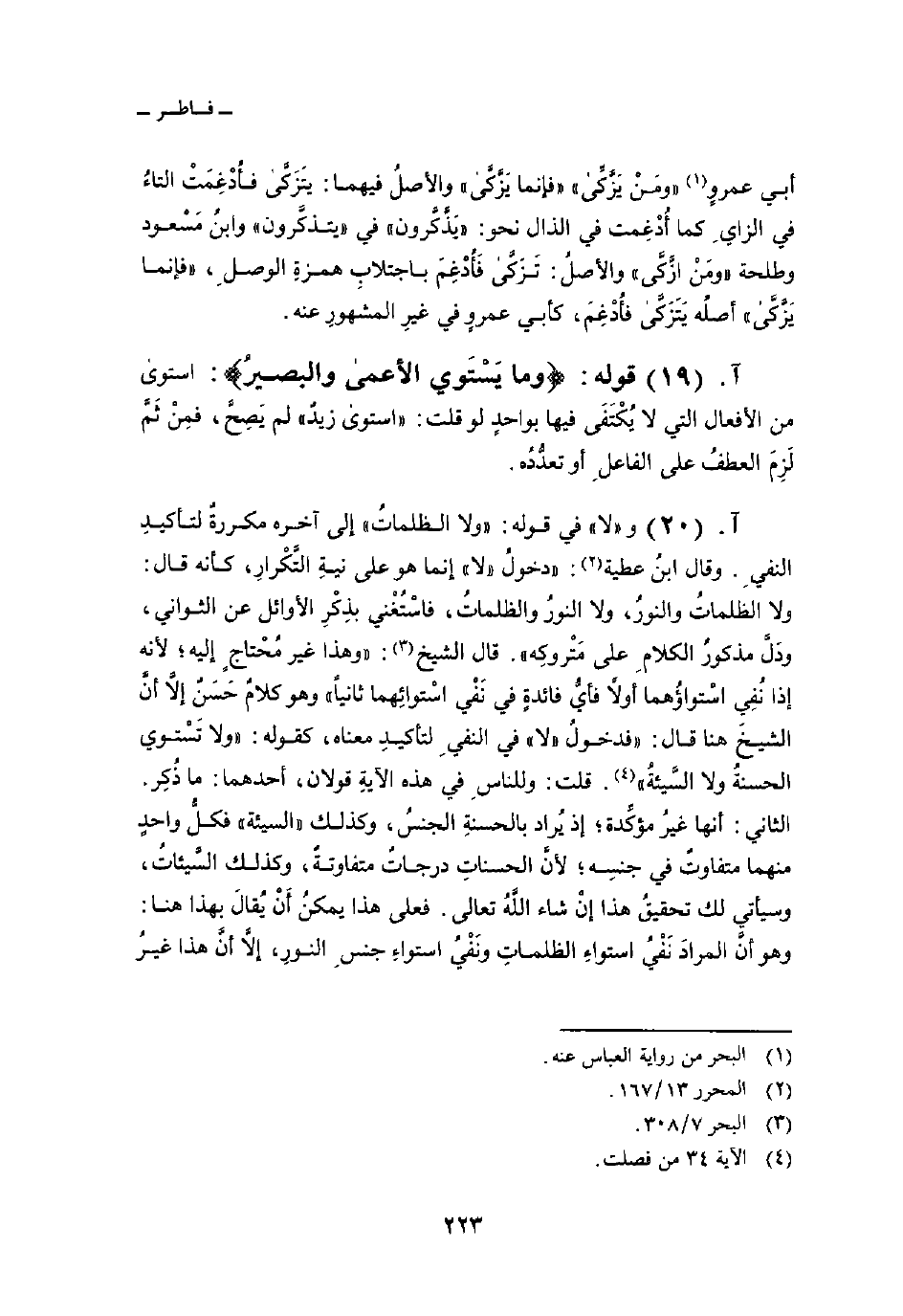 و «لا» في قوله: «ولا الظلماتُ» إلى آخره مكررةٌ لتأكيدِ النفيِ. وقال ابنُ عطية: «دخولُ» لا «إنما هو على نيةِ التَّكْرارِ، كأنه قال: ولا الظلماتُ والنورُ، ولا النورُ والظلماتُ، فاسْتُغْني بذِكْرِ الأوائل عن الثواني، ودَلَّ مذكورُ الكلامِ على مَتْروكِه» . قال الشيخ: «وهذا غير مُحْتاجٍ إليه؛ لأنه إذا نُفِي اسْتواؤُهما أولاً فأيُّ فائدةٍ في نَفْي اسْتوائِهما ثانياً» وهو كلامٌ حَسَنٌ إلاَّ أنَّ الشيخَ هنا قال: «فدخولُ» لا «في النفيِ لتأكيدِ معناه، كقوله: {وَلاَ تَسْتَوِي الحسنة وَلاَ السيئة} [فصلت: 34] . قلت: وللناسِ في هذه الآيةِ قولان، أحدهما: ما ذُكِر. الثاني: أنها غيرُ مؤكِّدة؛ إذ يُراد بالحسنةِ الجنسُ، وكذلك» السيئة «فكلُّ واحدٍ منهما متفاوتٌ في جنسِه؛ لأنَّ الحسناتِ درجاتٌ متفاوتةٌ، وكذلك السَّيئاتُ، وسيأتي لك تحقيقُ هذا إنْ شاء اللَّهُ تعالى. فعلى هذا يمكنُ أَنْ يُقالَ بهذا هنا: وهو أنَّ المرادَ نَفْيُ استواءِ الظلماتِ ونَفْيُ استواءِ جنسِ النورِ، إلاَّ أنَّ هذا غيرُ