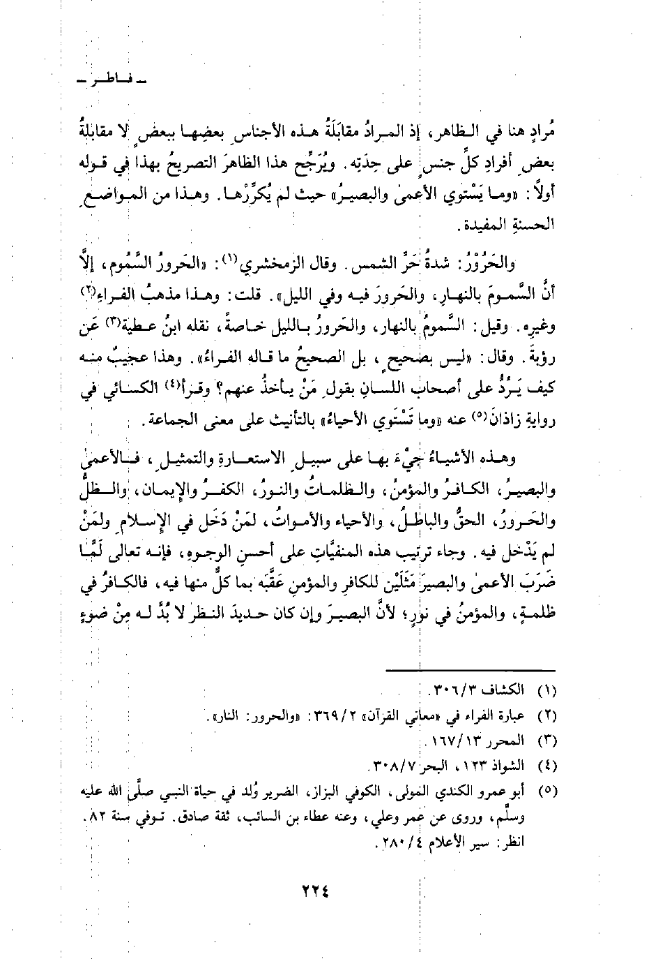 وهذه الأشياءُ جيْءَ بها على سبيلِ الاستعارةِ والتمثيلِ، فالأعمى والبصيرُ، الكافرُ والمؤمنُ، والظلماتُ والنورُ، الكفرُ والإِيمان، والظلُّ والحَرورُ، الحقُّ والباطلُ، والأحياء والأمواتُ، لمَنْ دَخَل في الإِسلامِ لَمَّا ضَرَبَ الأعمى والبصيرَ مَثَلَيْن للكافرِ والمؤمنِ عَقَّبَه بما كلٌّ منها فيه، فالكافرُ في ظلمةٍ، والمؤمنُ في نورٍ؛ لأنَّ البصيرَ وإن كان حديدَ النظر لا بُدَّ له مِنْ ضوءٍ