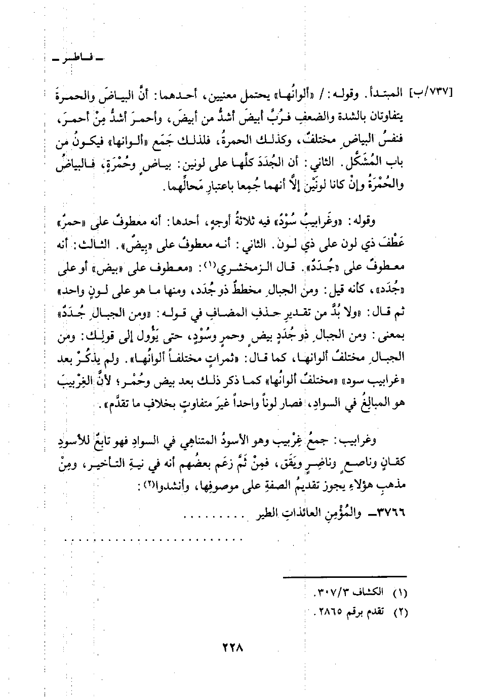 وقوله:» وغَرابيبُ سُوْدٌ «فيه ثلاثةُ أوجهٍ، أحدها: أنه معطوفٌ على» حمرٌ «عَطْفَ ذي لون على ذي لون. الثاني: أنه معطوفٌ على» بِيضٌ «. الثالث: أنه معطوفٌ على» جُدَدٌ «. قال الزمخشري:» معطوف على «بيض» أو على «جُدَد» ، كأنه قيل: ومن الجبالِ مخططٌ ذو جُدَد، ومنها ما هو على لونٍ واحد «ثم قال:» ولا بُدَّ من تقديرِ حذفِ المضافِ في قوله: {وَمِنَ الجبال جُدَدٌ} بمعنى: ومن الجبالِ ذو جُدَدٍ بيضٍ وحمرٍ وسُوْدٍ، حتى يَؤُول إلى قولِك: ومن الجبالِ مختلفٌ ألوانها، كما قال: {ثَمَرَاتٍ مُّخْتَلِفاً أَلْوَانُهَا} .