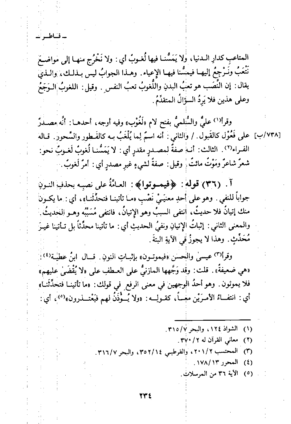وقرأ عيسى والحسن «فيموتون» بإثباتِ النونِ. قال ابنُ عطية: «هي ضعيفةٌ» . قلت: وقد وَجَّهها المازنيُّ على العطفِ على {لاَ يقضى عَلَيْهِمْ} فلا يموتون. وهو أحدُ الوجهين في معنى الرفعِ في قولك: «ما تأتينا فتحدِّثنا» أي: انتفاءُ الأمرَيْن معاً، كقولِه: {وَلاَ يُؤْذَنُ لَهُمْ فَيَعْتَذِرُونَ} [المرسلات: 36] ، أي: