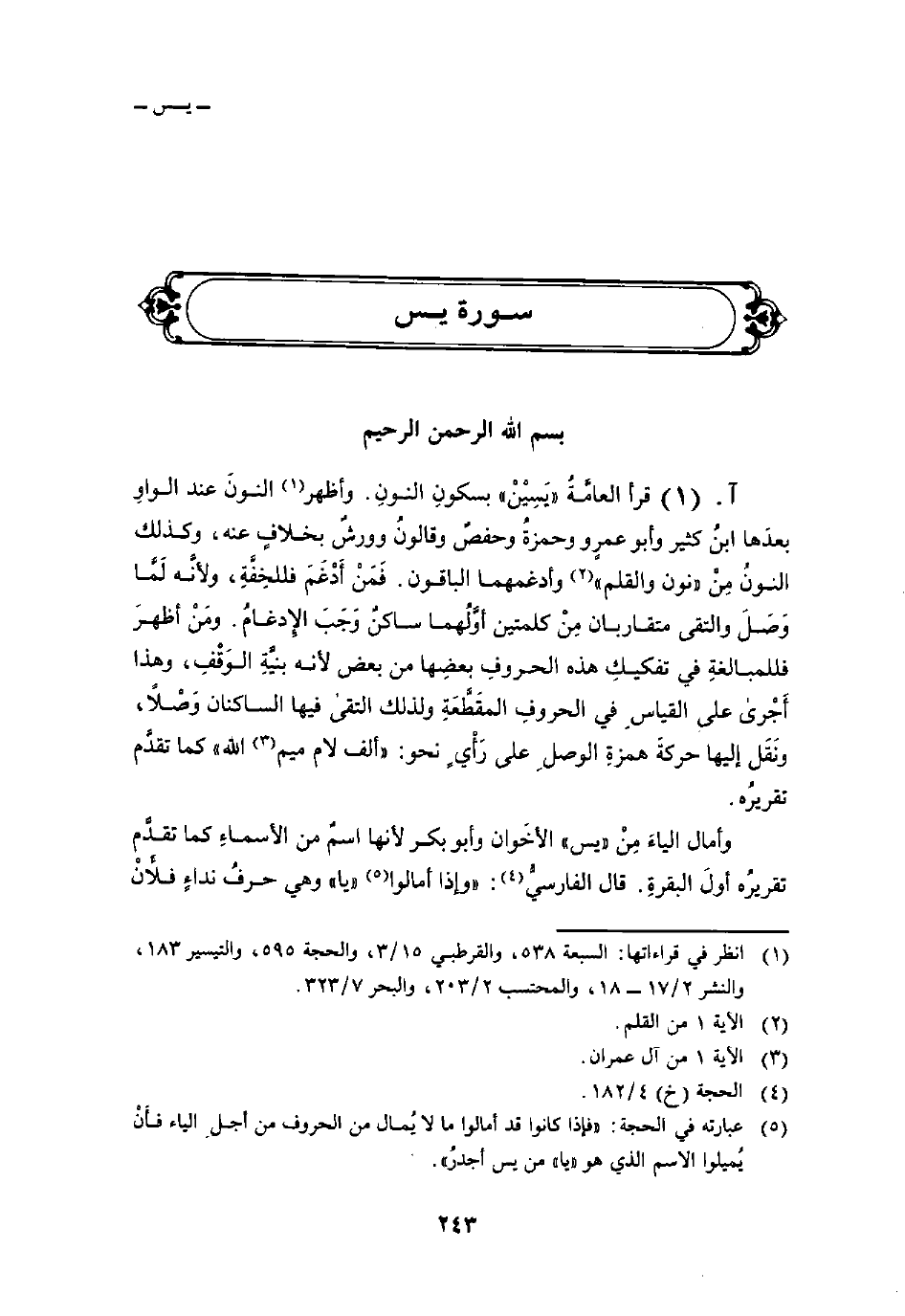 قرأ العامَّةُ «يَسِيْنْ» بسكونِ النونِ. وأظهر النونَ عند الواوِ بعدَها ابنُ كثير وأبو عمرٍو وحمزةُ وحفصٌ وقالونُ وورشٌ بخلافٍ عنه، وكذلك النونُ مِنْ {ن والقلم} [القلم: 1] وأدغمهما الباقون. فَمَنْ أَدْغَمَ فللخِفَّةِ، ولأنَّه لَمَّا وَصَل والتقى متقاربان مِنْ كلمتين أوَّلُهما ساكنٌ وَجَبَ الإِدغامُ. ومَنْ أظهرَ فللمبالغةِ في تفكيكِ هذه الحروفِ بعضِها من بعض لأنه بنيَّةِ الوَقْفِ، وهذا أَجْرى على القياسِ في الحروفِ المقَطَّعَةِ ولذلك التقى فيها الساكنان وَصْلاً، ونَقَل إليها حركةَ همزةِ الوصلِ على رَأْيٍ نحو: {ألف لام ميم الله} كما تقدَّم تقريرُه.