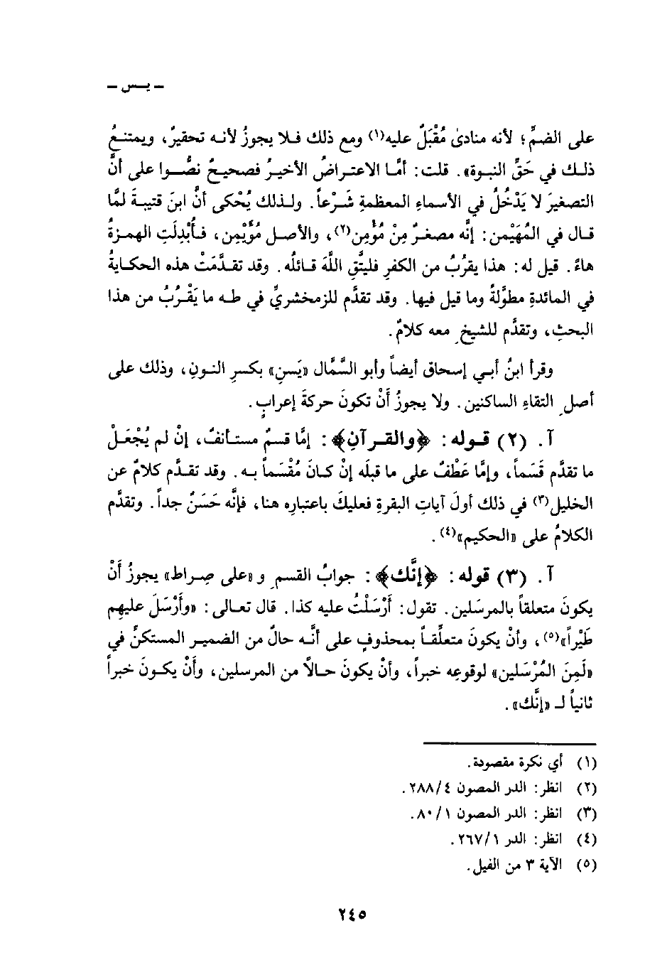 واقرأ ابنُ أبي إسحاق أيضاً وأبو السَّمَّال» يَسنِ «بكسرِ النونِ، وذلك على أصلِ التقاءِ الساكنين. ولا يجوزُ أَنْ تكونَ حركةَ إعرابٍ.
