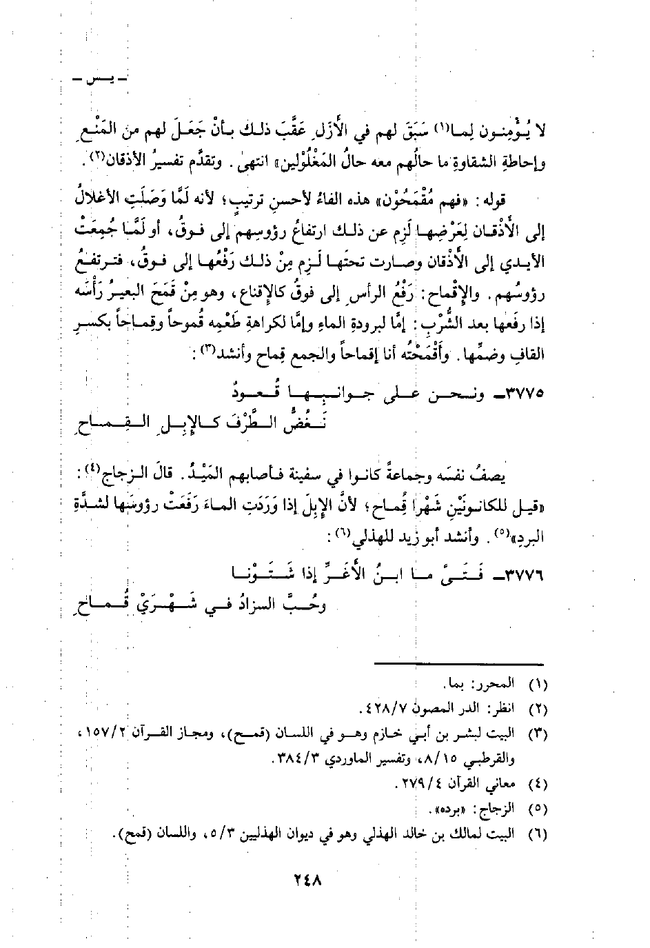 قوله: «فهم مُقْمَحُوْن» هذه الفاءُ لأحسنِ ترتيبٍ؛ لأنه لَمَّا وَصَلَتِ الأغلالُ إلى الأَذْقان لِعَرْضِها لَزِم عن ذلك ارتفاعُ روؤسِهم إلى فوقُ، أو لَمَّا جُمِعَتْ الأيدي إلى الأَذْقان وصارت تحتَها لَزِم مِنْ ذلك رَفْعُها إلى فوقُ، فترتفعُ رؤوسُهم. والإِقْماح: رَفْعُ الرأسِ إلى فوقُ كالإِقناع، وهو مِنْ قَمَحَ البعيرُ رَأْسَه إذا رفَعها بعد الشُّرْبِ: إمَّا لبرودةِ الماءِ وإمَّا لكراهةِ طَعْمِه قُموحاً وقِماحاً بكسرِ القافِ وضمِّها. وأَقْمَحْتُه أنا إقماحاً والجمع قِماح وأنشد: