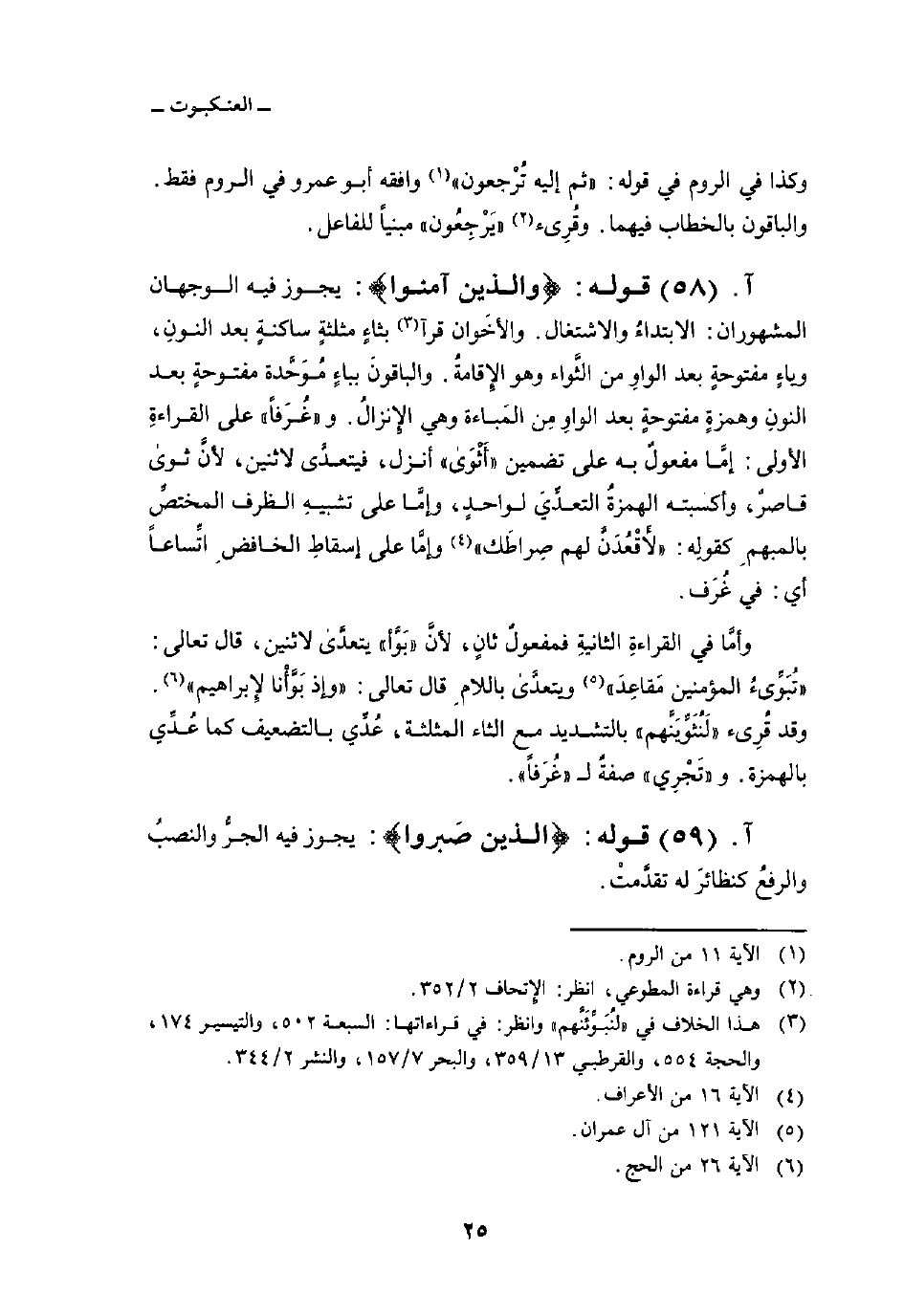 قوله: {والذين آمَنُواْ} : يجوز فيه الوجهان المشهوران: الابتداءُ والاشتغال. والأخَوان قرآ بثاءٍ مثلثةٍ ساكنةٍ بعد النونِ، وياءٍ مفتوحةٍ بعد الواوِ من الثَّواء وهو الإِقامةُ. والباقونَ بباءٍ مُوَحَّدة مفتوحةٍ بعد النونِ وهمزةٍ مفتوحةٍ بعد الواوِ من المَباءة وهي الإِنزالُ. و «غُرفاً» على القراءةِ الأولى: إمَّا مفعولٌ به على تضمين «أَثْوَى» أنزل، فيتعدَّى لاثنين، لأنَّ ثوى قاصرٌ، وأكسبته الهمزةُ التعدِّيَ لواحدٍ، وإمَّا على تشبيهِ الظرف المختصِّ بالمبهمِ كقولِه: {لأَقْعُدَنَّ لَهُمْ صِرَاطَكَ} [الأعراف: 16] وإمَّا على إسقاطِ الخافضِ اتِّساعاً أي: في غُرَف.