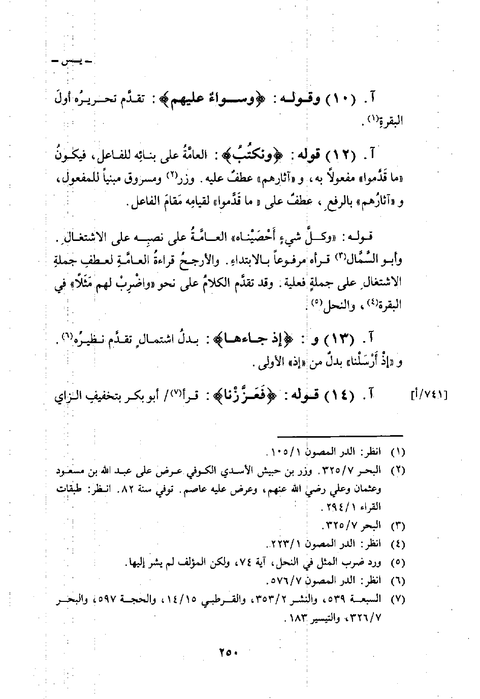 قوله: {وَنَكْتُبُ} : العامَّةُ على بنائِه للفاعل، فيكونُ «ما قَدَّموا» مفعولاً به، و «آثارهم» عطفٌ عليه. وزر ومسروق مبنياً للمفعول، و «آثارُهم» بالرفعِ، عطف على «ما قَدَّموا» لقيامِه مَقامَ الفاعل.