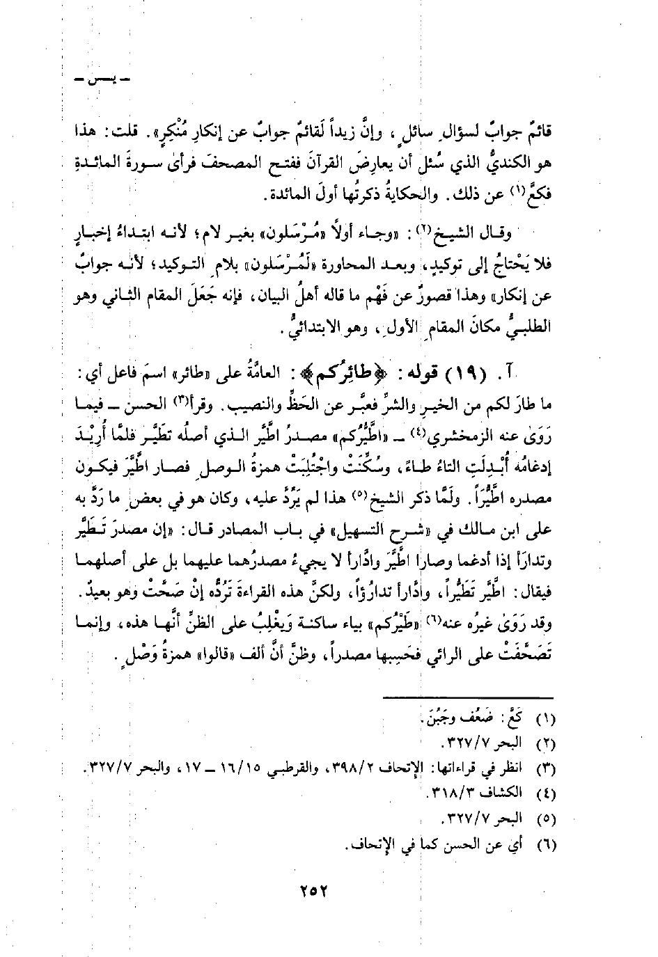 قوله: {طَائِرُكُم} : العامَّةُ على «طائر» اسمَ فاعل أي: ما طارَ لكم من الخيرِ والشرِّ فعبَّر عن الحَظِّ والنصيب. وقرأ الحسن - فيما رَوَى عنه الزمخشري - «اطَّيُّرُكم» مصدرُ اطَّيَّر الذي أصلُه تطَيَّر فلمَّا أُرِيْدَ إدغامُه أُبْدِلَتِ التاءُ طاءً، وسُكِّنَتْ واجْتُلِبَتْ همزةُ الوصلِ فصار اطَّيَّرَ فيكون مصدره اطَّيُّرَاً. ولَمَّا ذكر الشيخ هذا لم يَرُدَّ عليه، وكان هو في بعضِ ما رَدَّ به على ابن مالك في «شرح التسهيل» في باب المصادر قال: «إن مصدرَ تَطَيَّر وتدارَأ إذا أدغما وصارا اطَّيَّرَ وادَّارأ لا يجيءُ مصدرُهما عليهما بل على أصلهما فيقال: اطَّيَّر تَطَيُّراً، وادَّارأ تدارُؤاً، ولكنَّ هذه القراءةَ تَرُدُّه إنْ صَحَّتْ وهو بعيدٌ. وقد رَوَى غيرُه عنه» طَيْرُكم «بياء ساكنة ويَغْلِبُ على الظنِّ أنَّها هذه، وإنما تَصَحَّفَتْ على الرائي فحَسِبها مصدراً، وظنَّ أنَّ ألف» قالوا «همزةُ وَصْلٍ.