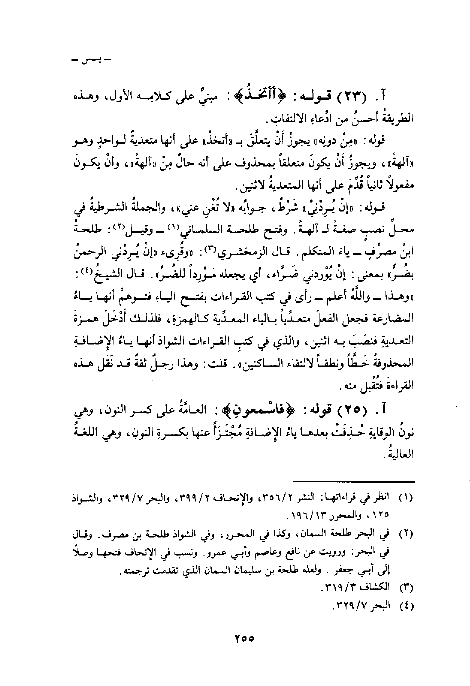 قوله: «إنْ يُرِدْنِيْ» شَرْطٌ، جوابُه {لاَّ تُغْنِ عَنِّي} ، والجملةُ الشرطيةُ في محلِّ نصبٍ صفةً ل آلهةً. وفتح طلحة السلماني - وقيل: طلحةُ ابنُ مصرِّفٍ - ياءَ المتكلم. قال الزمخشري: «وقُرِئ» {إِن يُرِدْنِي الرحمن بِضُرٍّ} بمعنى: إنْ يُوْردني ضَرَّاء، أي يجعله مَوْرِداً للضُرِّ «. قال الشيخُ:» وهذا - واللَّهُ أعلم - رأى في كتب القراءات بفتح الياءِ فتوهمَّ أنها ياءُ المضارعة فجعل الفعلَ متعدِّياً بالياء المعدِّية كالهمزةِ، فلذلك أَدْخَلَ همزةَ التعديةِ فنصَبَ به اثنين، والذي في كتبِ القراءات الشواذ أنها ياءُ الإِضافةِ المحذوفةُ خَطَّاً ونطقاً لالتقاء الساكنين «. قلت: وهذا رجلٌ ثقةٌ قد نَقَل هذه القراءةَ فتُقْبل منه.