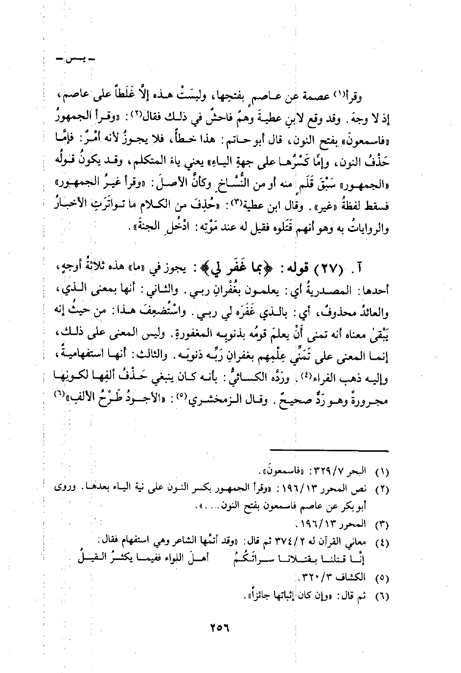 وقرأ عصمة عن عاصمٍ بفتحِها، وليسَتْ هذه إلاَّ غَلَطاً على عاصم، إذ لا وجهَ. وقد وقع لابنِ عطيةَ وهمٌ فاحشٌ في ذلك فقال: «وقرأ الجمهورُ» فاسمعونَ «بفتح النون، قال أبو حاتم: هذا خطأٌ، فلا يجوزُ لأنه أمْرٌ: فإمَّا حَذْفُ النون، وإمَّا كَسْرُها على جهةِ الياءِ» يعني ياءَ المتكلم، وقد يكونُ قولُه «الجمهور» سَبْقَ قَلَمٍ منه أو من النُّسَّاخِ وكأنَّ الأصلَ: «وقرأ غيرُ الجمهور» فسقط لفظةُ «غير» . وقال ابن عطية: «حُذِفَ من الكلام ما تواتَرَتِ الأخبارُ والرواياتُ به وهو أنهم قَتَلوه فقيل له عند مَوْتِه: ادْخُلِ الجنةَ» .