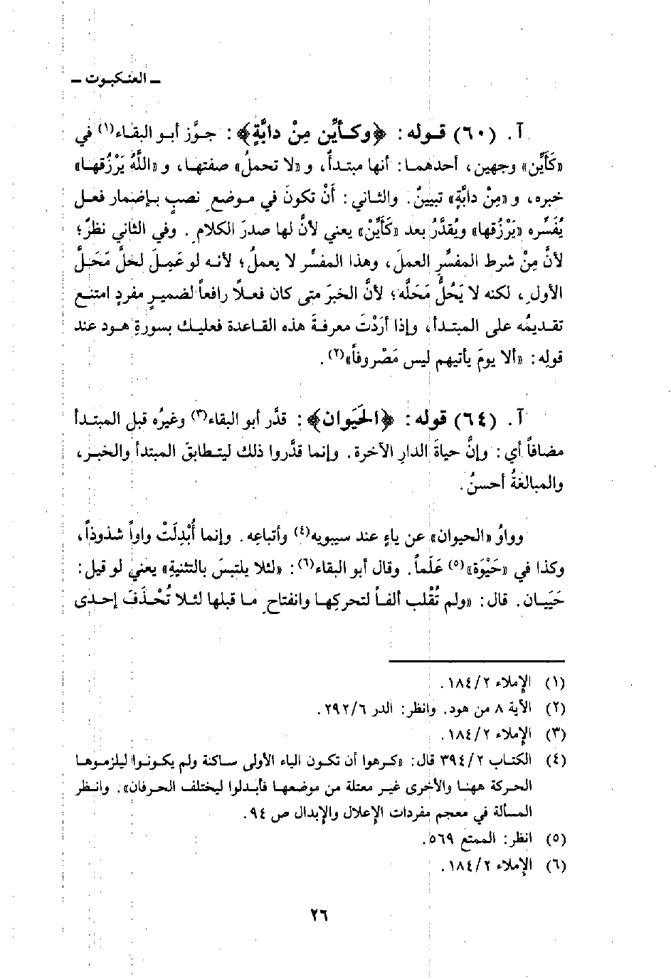 وواوُ «الحيوان» عن ياءٍ عند سيبويه وأتباعِه. وإنما أُبْدِلَتْ واواً شذوذاً، وكذا في «حَيْوَة» عَلَماً. وقال أبو البقاء: «لئلا يلتبسَ بالتثنيةِ» يعني لو قيل: حَيَيان. قال: «ولم تُقْلب ألفاً لتحركِها وانفتاحِ ما قبلها لئلا تُحْذَفَ إحدى