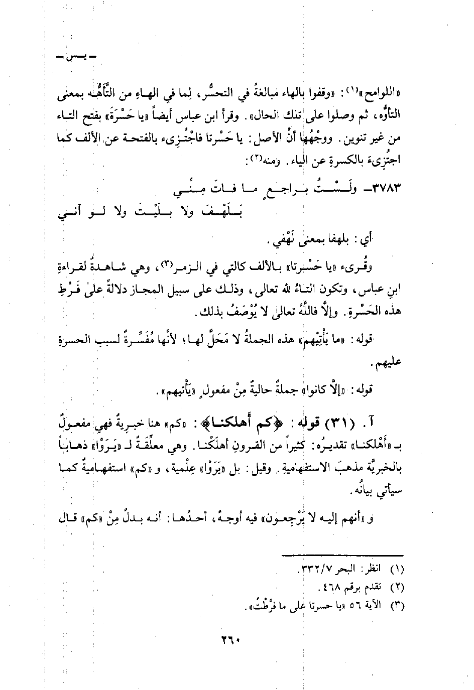 اللوامح» : «وقفوا بالهاء مبالغةً في التحسُّر، لِما في الهاءِ من التَّأَهُّه بمعنى التأوُّه، ثم وصلوا على تلك الحال» . وقرأ ابن عباس أيضاً «يا حَسْرَةَ» بفتح التاء من غير تنوين. ووجْهُها أنَّ الأصل: يا حَسْرتا فاجْتُزِئ بالفتحة عن الألف كما اجتُزِئ بالكسرةِ عن الياء. ومنه: