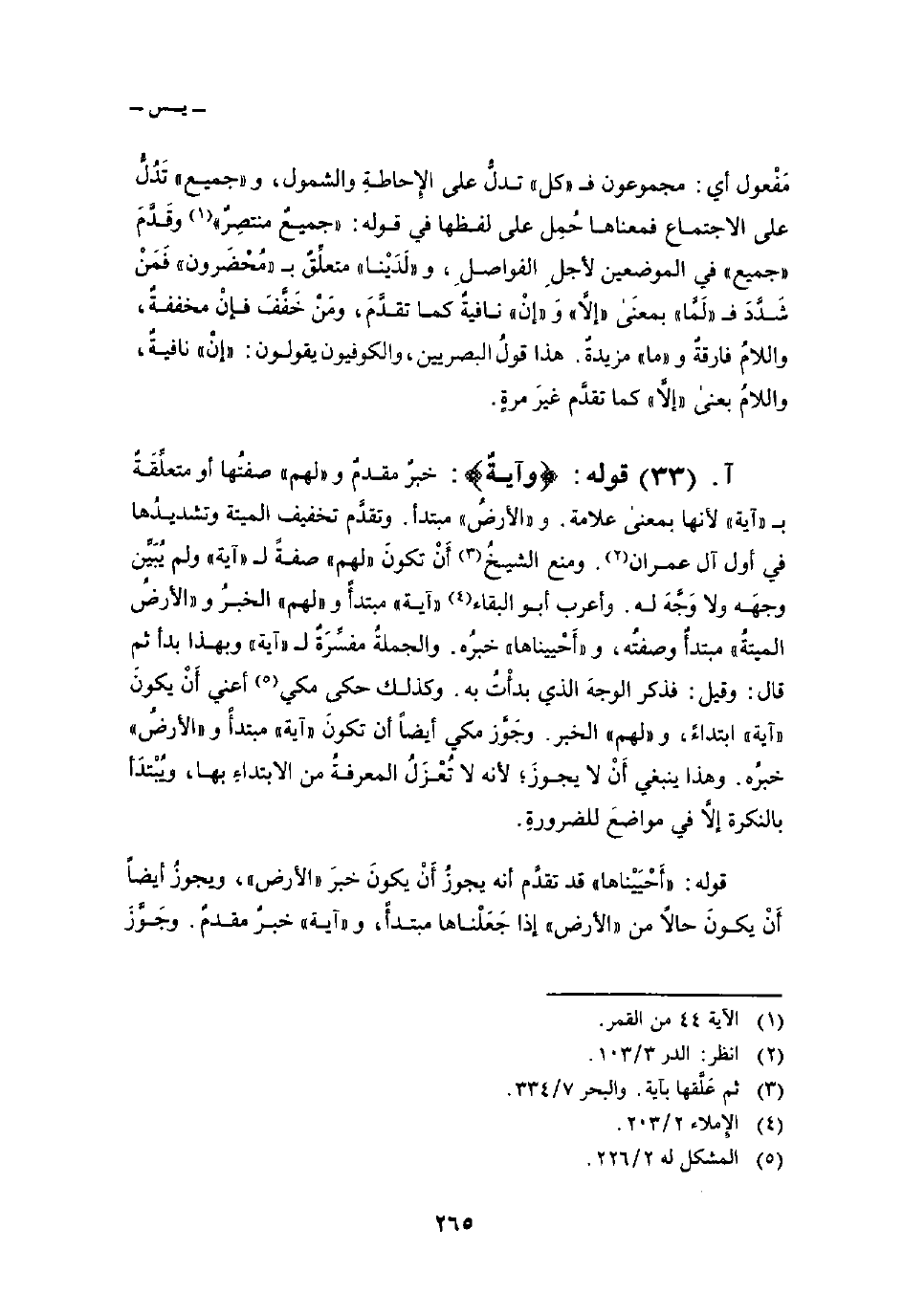 قوله: {وَآيَةٌ} : خبرٌ مقدمٌ و «لهم» صفتُها أو متعلِّقَةٌ ب «آية» لأنها بمعنى علامة. و «الأرضُ» مبتدأ. وتقدَّم تخفيف الميتة وتشديدُها في أول آل عمران. ومنع الشيخُ أَنْ تكونَ «لهم» صفةً ل «آية» ولم يُبَيِّن وجهَه ولا وَجَّهَ له. وأعرب أبو البقاء «آية» مبتدأً و «لهم» الخبرُ و «الأرضُ الميتةُ» مبتدأٌ وصفتُه، و «أَحْييناها» خبرُه. والجملةُ مفسِّرَةٌ ل «آية» وبهذا بدأ ثم قال: وقيل: فذكر الوجهَ الذي بدأْتُ به. وكذلك حكى مكي أعني أَنْ يكونَ «آية» ابتداءً، و «لهم» الخبر. وجَوَّز مكي أيضاً أن تكونَ «آية» مبتدأً و «الأرضُ» خبرُه. وهذا ينبغي أَنْ لا يجوزَ؛ لأنه لا تُعْزَلُ المعرفةُ من الابتداءِ بها، ويُبْتَدأ بالنكرة إلاَّ في مواضعَ للضرورةِ.