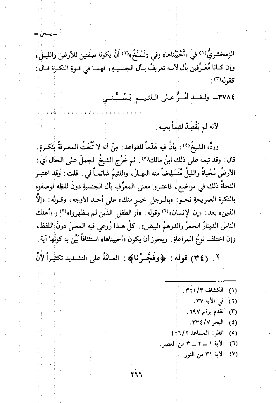 الزمخشريُّ في «أَحْيَيْناها» وفي «نَسْلَخُ» أَنْ يكونا صفتين للأرض والليل، وإن كانا مُعَرَّفين بأل لأنه تعريفٌ بأل الجنسيةِ، فهما في قوةِ النكرة قال: كقوله: