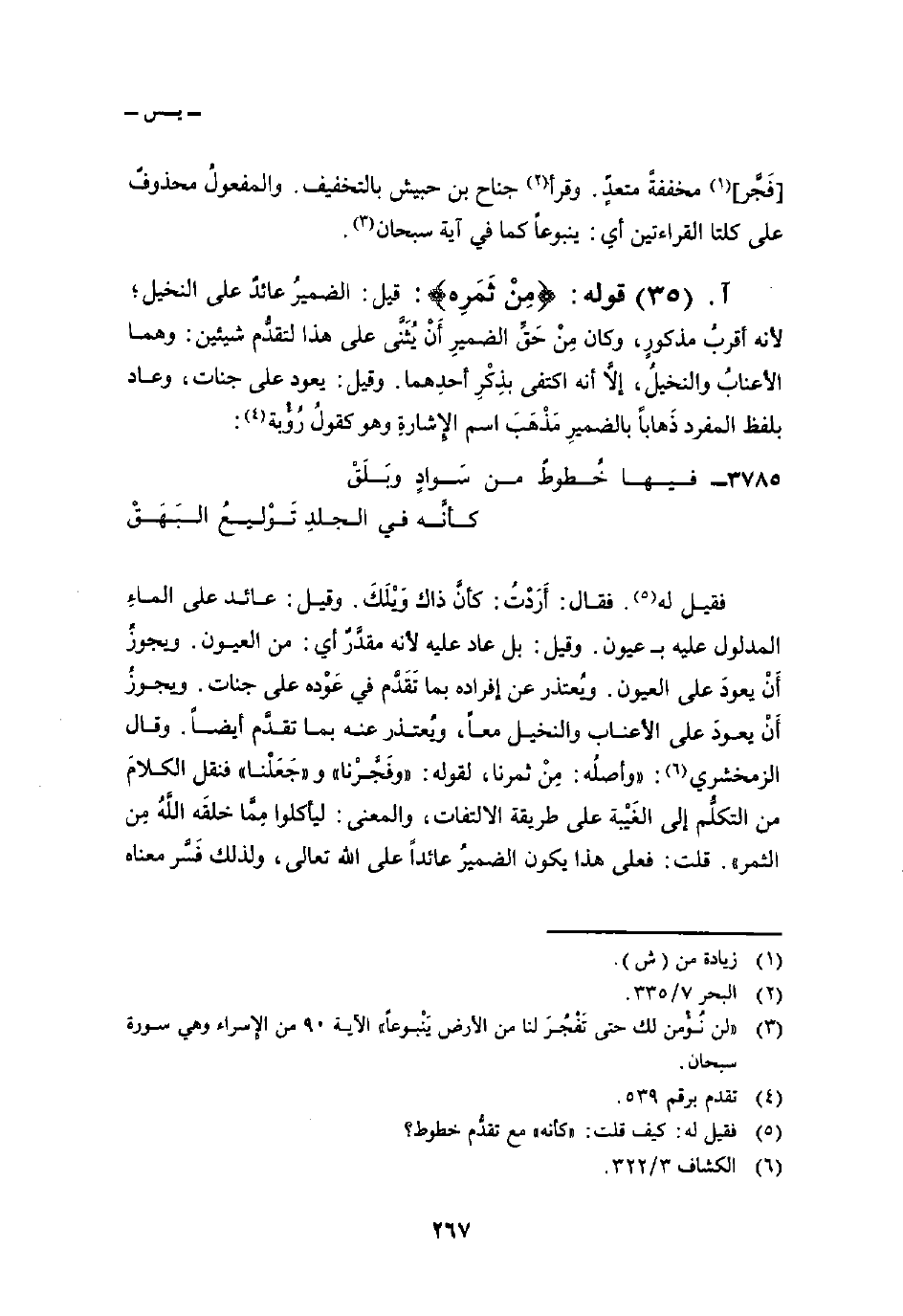 فقيل له. فقال: أَرَدْتُ: كأنَّ ذاك وَيْلَكَ. وقيل: عائد على الماءِ المدلول عليه ب عيون. وقيل: بل عاد عليه لأنه مقدَّرٌ أي: من العيون. ويجوزُ أَنْ يعودَ على العيون. ويُعتذر عن إفراده بما تَقَدَّم في عَوْده على جنات. ويجوزُ أَنْ يعودَ على الأعناب والنخيل معاً، ويُعتذر عنه بما تقدَّم أيضاً. وقال الزمخشري: «وأصلُه: مِنْ ثمرنا، لقوله:» وفَجَّرْنا «و» جَعَلْنا «فنقل الكلامَ من التكلُّم إلى الغَيْبة على طريقة الالتفات، والمعنى: ليأكلوا مِمَّا خلقَه الَّلهُ مِن الثمر» . قلت: فعلى هذا يكون الضميرُ عائداً على الله تعالى، ولذلك فَسَّر معناه