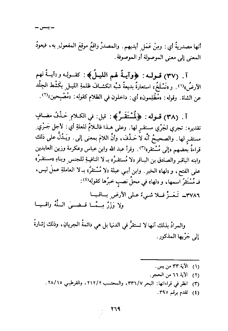 قوله: {لِمُسْتَقَرٍّ} : قيل: في الكلامِ حَذْفُ مضافٍ تقديره: تجري لجَرْي مستقرٍ لها. وعلى هذا فاللامُ للعلةِ أي: لأجل جَرْيِ مستقرٍ لها. والصحيحُ أنَّه لا حَذْفَ، وأنَّ اللامَ بمعنى إلى. ويَدُلُّ على ذلك قراءةُ بعضهم «إلى مُسْتقر» . وقرأ عبد الله وابن عباس وعكرمة وزين العابدين وابنه الباقر والصادق بن الباقر «لا مُستقرَّ» ب لا النافيةِ للجنسِ وبناءِ «مستقرَّ» على الفتح، و «لها» الخبر. وابن أبي عبلة «لا مُسْتقرٌ» ب لا العاملةِ عملَ ليس، ف مُسْتَقرٌ اسمها، و «لها» في محلِّ نصبٍ خبرُها كقولِه: