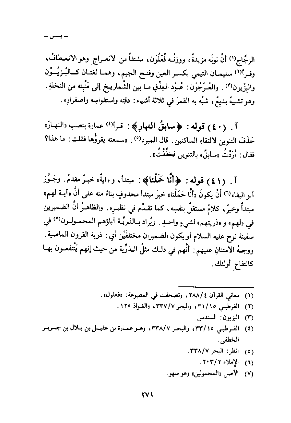 قوله: {أَنَّا حَمَلْنَا} : مبتدأ، و «آيةٌ» خبرٌ مقدمٌ. وجَوَّز أبو البقاء أَنْ يكونَ «أنَّا حَمَلْنا» خبرَ مبتدأ محذوفٍ بناءٍ منه على أنَّ «آية لهم» مبتدأٌ وخبرٌ، كلامٌ مستقلٌ بنفسِه، كما تقدَّم في نظيرِه. والظاهرُ أنَّ الضميرين في «لهم» و «ذريتهم» لشيءٍ واحدٍ. ويُراد بالذريَّة آباؤهم المحمولون في سفينة نوح عليه السلام أو يكون الضميران مختلفَيْن أي: ذرية القرون الماضية. ووجهُ الامتنانِ عليهم: أنَّهم في ذلك مثلُ الذرِّية من حيث إنهم يَنْتفعون بها كانتفاعِ أولئك.