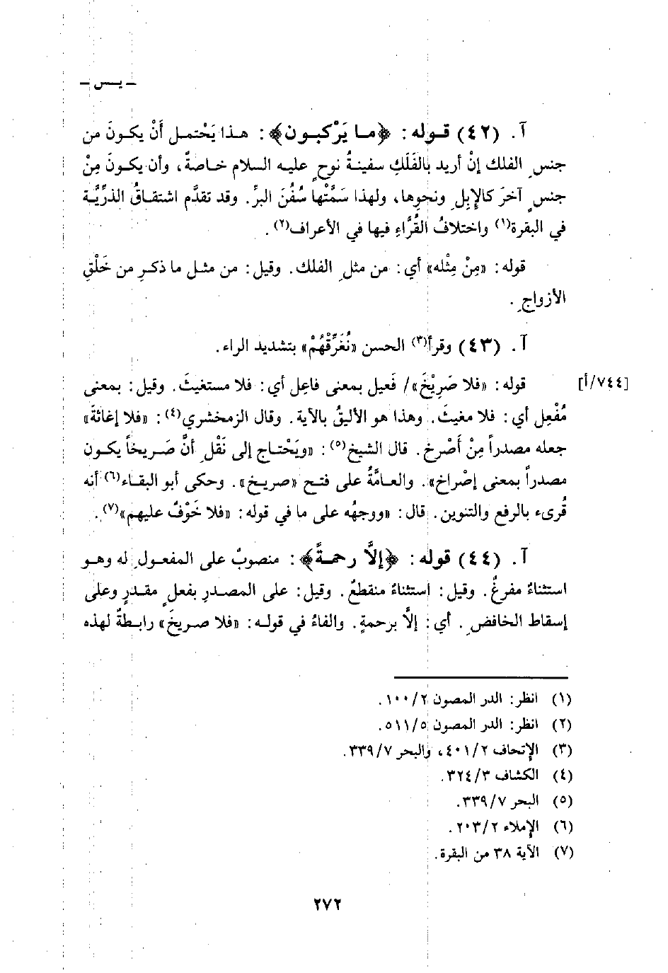 قوله: {إِلاَّ رَحْمَةً} : منصوبٌ على المفعولِ له وهو استثناءٌ مفرغٌ. وقيل: استثناءٌ منقطعٌ. وقيل: على المصدرِ بفعلٍ مقدرٍ وعلى إسقاط الخافضِ. أي: إلاَّ برحمةٍ. والفاءُ في قوله: «فلا صريخَ» رابطةٌ لهذه