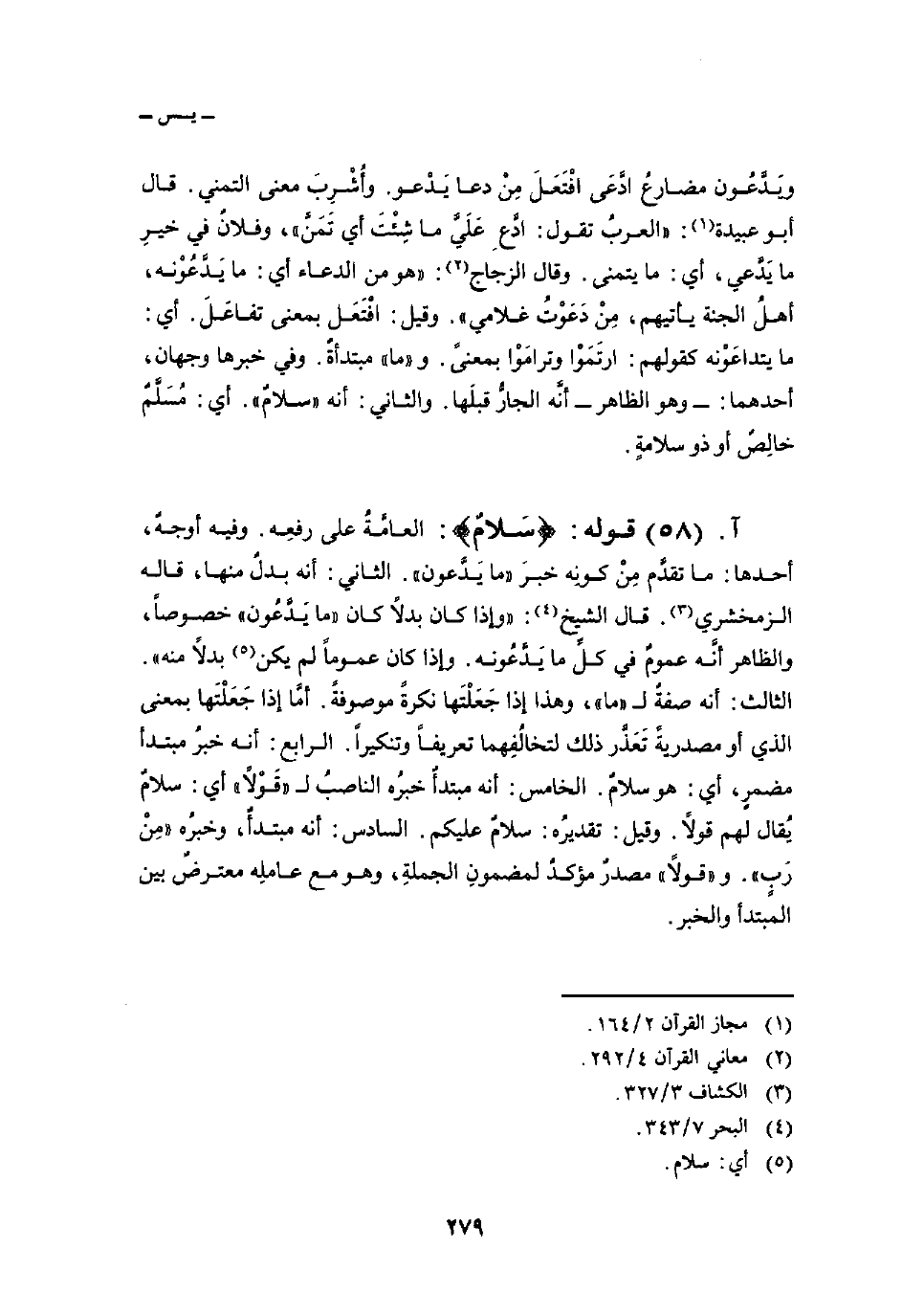 قوله: {سَلاَمٌ} : العامَّةُ على رفعِه. وفيه أوجهٌ، أحدها: ما تقدَّم مِنْ كونِه خبرَ «ما يَدَّعون» . الثاني: أنه بدلٌ منها، قاله الزمخشري. قال الشيخ: «وإذا كان بدلاً كان» ما يَدَّعُون «خصوصاً، والظاهر أنَّه عمومٌ في كلِّ ما يَدَّعُونه. وإذا كان عموماً لم يكن بدلاً منه» . الثالث: أنه صفةٌ ل «ما» ، وهذا إذا جَعَلْتَها نكرةً موصوفةً. أمَّا إذا جَعَلْتَها بمعنى الذي أو مصدريةً تَعَذَّر ذلك لتخالُفِهما تعريفاً وتنكيراً. الرابع: أنه خبرُ مبتدأ مضمرٍ، أي: هو سلامٌ. الخامس: أنه مبتدأٌ خبرُه الناصبُ ل «قَوْلاً» أي: سلامٌ يُقال لهم قولاً. وقيل: تقديرُه: سلامٌ عليكم. السادس: أنه مبتدأٌ، وخبرُه «مِنْ رَبٍ» . و «قولاً» مصدرٌ مؤكدٌ لمضمونِ الجملةِ، وهو مع عاملِه معترضٌ بين المبتدأ والخبر.
