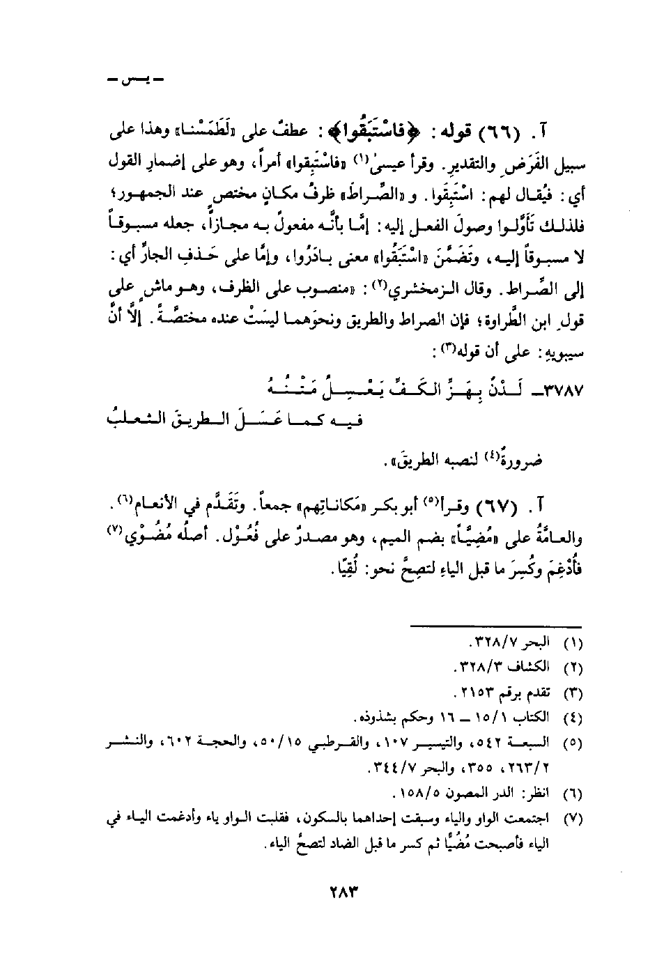 قوله: {فاستبقوا} : عطفٌ على «لَطَمَسْنا» وهذا على سبيل الفَرَضِ والتقديرِ. وقرأ عيسى «فاسْتَبِقوا» أمراً، وهو على إضمارِ القول أي: فيُقال لهم: اسْتَبِقَوا. و «الصِّراطَ» ظرفُ مكانٍ مختصٍ عند الجمهور؛ فلذلك تَأوَّلوا وصولَ الفعل إليه: إمَّا بأنَّه مفعولٌ به مجازاً، جعله مسبوقاً لا مسبوقاً إليه، وتَضَمَّنَ «اسْتَبَقُوا» معنى بادَرُوا، وإمَّا على حَذفِ الجارِّ أي: إلى الصِّراط. وقال الزمخشري: «منصوب على الظرف، وهو ماشٍ على قولِ ابن الطَّراوة؛ فإن الصراط والطريق ونحوَهما ليسَتْ عنده مختصَّةً. إلاَّ أنَّ سيبويهِ: على أن قوله:
