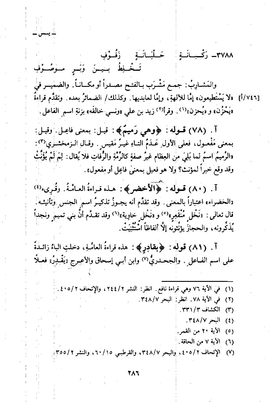 والمَشارِبُ: جمع مَشْرَب بالفتح مصدراً أو مكاناً. والضمير في «لا يَسْتَطيعون» إمَّا للآلهةِ، وإمَّا لعابديها. وكذلك/ الضمائرُ بعده. وتقدَّم قرءاةُ «يَحْزُن» و «يُحزن» . وقرأ زيد بن علي «ونسي خالقَه» بزنةِ اسمِ الفاعل.