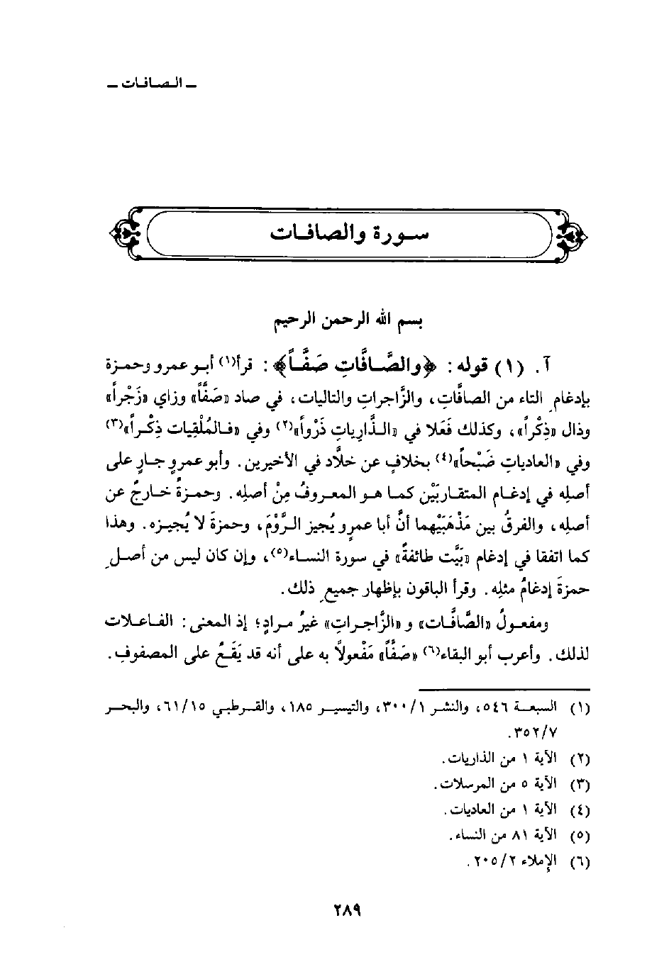 قوله: {والصافات صَفَّا} : قرأ أبو عمرو وحمزة بإدغامِ التاء من الصافَّاتِ، والزَّاجراتِ والتاليات، في صاد «صَفَّاً» وزاي «زَجْراً» وذال «ذِكْراً» ، وكذلك فَعَلا في {والذاريات ذَرْواً} [الذاريات: 1] وفي {فالملقيات ذِكْراً} [المرسلات: 5] وفي {العاديات ضَبْحاً} [العاديات: 1] بخلافٍ عن خلاَّد في الأخيرين. وأبو عمروٍ جارٍ على أصلِه في إدغام المتقاربَيْن كما هو المعروفُ مِنْ أصلِه. وحمزةُ خارجٌ عن أصلِه، والفرقُ بين مَذْهَبَيْهما أنَّ أبا عمرٍو يُجيز الرَّوْمَ، وحمزةَ لا يُجيزه. وهذا كما اتفقا في إدغام {بَيَّتَ طَآئِفَةٌ} في سورة النساء [الآية: 81] ، وإن كان ليس من أصلِ حمزةَ إدغامُ مثلِه. وقرأ الباقون بإظهار جميعِ ذلك.