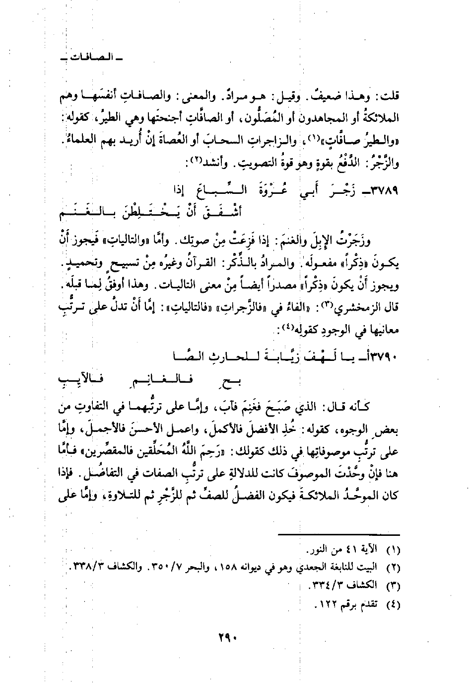قلت: وهذا ضعيفٌ. وقيل: هو مرادٌ. والمعنى: والصافاتِ أنفسَها وهم الملائكةُ أو المجاهدون أو المُصَلُّون، أو الصافَّاتِ أجنحتَها وهي الطيرُ، كقوله: {والطير صَآفَّاتٍ} [النور: 41] ، والزاجراتِ السحابَ أو العُصاةَ إنْ أُريد بهم العلماءُ. والزَّجْرُ: الدَّفْعُ بقوةٍ وهو قوةُ التصويتِ. وأنشد: