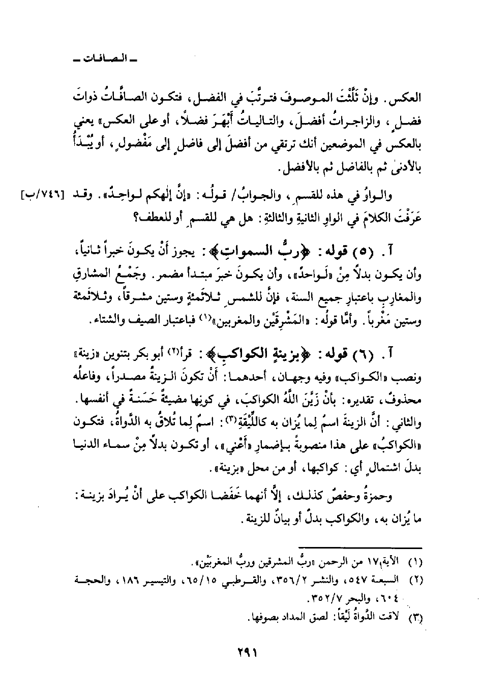 العكس. وإنْ ثَلَّثْتَ الموصوفَ فترتَّبَ في الفضل، فتكون الصافَّاتُ ذواتَ فضلٍ، والزاجراتُ أفضلَ، والتالياتُ أَبْهَرَ فضلاً، أو على العكس» يعني بالعكس في الموضعين أنك ترتقي من أفضلَ إلى فاضلٍ إلى مَفْضولٍ، أو يُبْدَأُ بالأدنى ثم بالفاضل ثم بالأفضل.