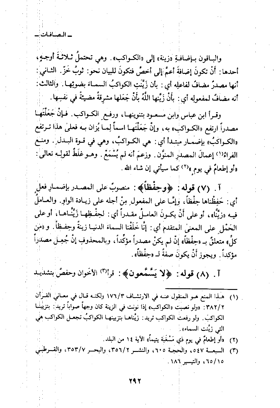 والباقون بإضافةِ «زينة» إلى «الكواكب» . وهي تحتملُ ثلاثةَ أوجهٍ، أحدها: أَنْ تكونَ إضافةَ أعمَّ إلى أخصَّ فتكونَ للبيان نحو: ثوبُ خَزّ. الثاني: أنها مصدرٌ مضافٌ لفاعلِه أي: بأن زَيَّنَتِ الكواكبُ السماءَ بضوئِها. والثالث: أنه مضافٌ لمفعولِه أي: بأَنْ زَيَّنها اللَّهُ بأَنْ جَعَلها مشرِقةً مضيئةً في نفسِها.