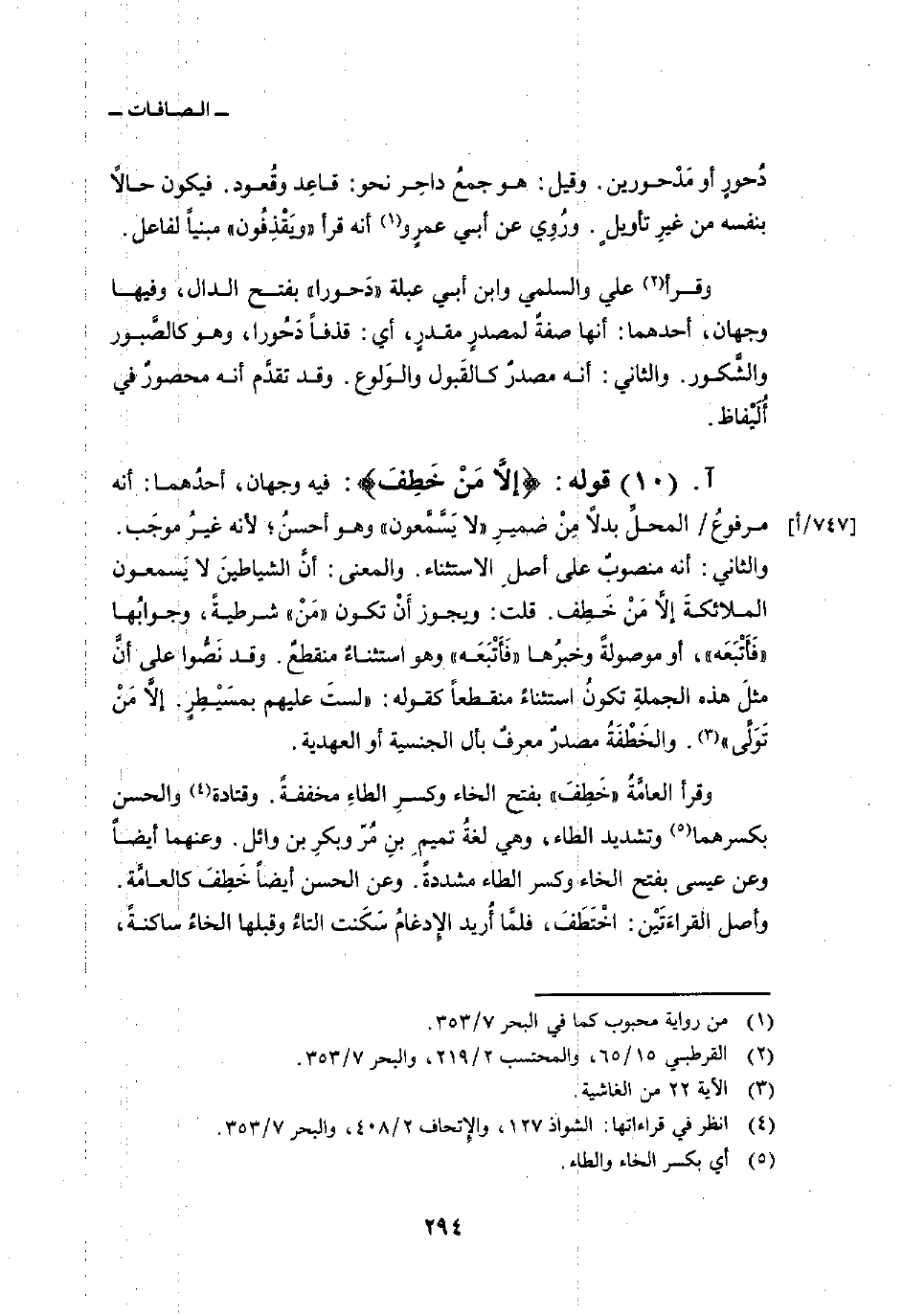 قوله: {إِلاَّ مَنْ خَطِفَ} : فيه وجهان، أحدُهما: أنه مرفوعُ/ المحلِّ بدلاً مِنْ ضميرِ «لا يَسَّمَّعون» وهو أحسنُ؛ لأنه غيرُ موجَب. والثاني: أنه منصوبٌ على أصلِ الاستثناء. والمعنى: أنَّ الشياطينَ لا يَسمعون الملائكةَ إلاَّ مَنْ خَطِف. قلت: ويجوز أَنْ تكون «مَنْ» شرطيةً، وجوابُها «فَأَتْبَعَه» ، أو موصولةً وخبرُها «فَأَتْبَعَه» وهو استثناءٌ منقطعٌ. وقد نَصُّوا على أنَّ مثلَ هذه الجملةِ تكونُ استثناءً منقطعاً كقوله: {لَّسْتَ عَلَيْهِم بِمُصَيْطِرٍ * إِلاَّ مَن تولى وَكَفَرَ} [الغاشية: 22 - 23] . والخَطْفَةُ مصدرٌ معرفٌ بأل الجنسية أو العهدية.
