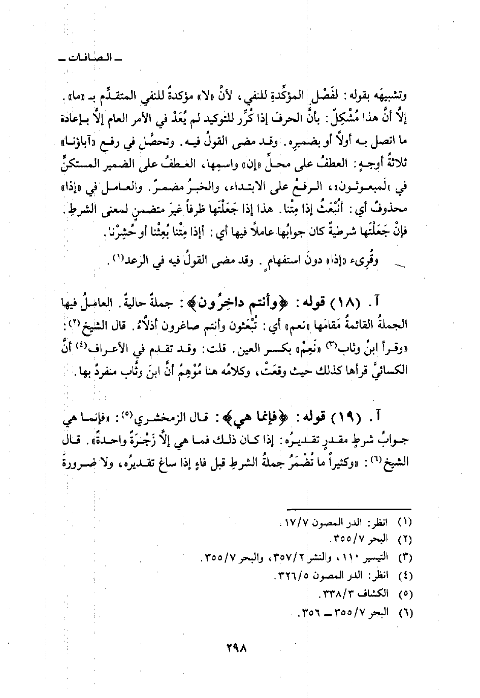 وتشبيهَه بقوله: لفَصْلِ المؤكِّدةِ للنفي، لأنَّ» لا «مؤكدةٌ للنفي المتقدِّم ب» ما «. إلاَّ أنَّ هذا مُشْكِلٌ: بأنَّ الحرفَ إذا كُرِّر للتوكيد لم يُعَدْ في الأمر العام إلاَّ بإعادة ما اتصل به أولاً أو بضميرِه. وقد مضى القولُ فيه. وتحصَّل في رفع» آباؤنا «ثلاثةُ أوجهٍ: العطفُ على محلِّ» إن «واسمِها، العطفُ على الضمير المستكنِّ في» لَمبعوثون «، الرفعُ على الابتداء، والخبرُ مضمرٌ. والعامل في» إذا «محذوفٌ أي: أنُبْعَثُ إذا مِتْنا. هذا إذا جَعَلْتَها ظرفاً غيرَ متضمنٍ لمعنى الشرطِ. فإنْ جَعَلْتَها شرطيةً كان جوابُها عاملاً فيها أي: أإذا مِتْنا بُعِثْنا أو حُشِرْنا.