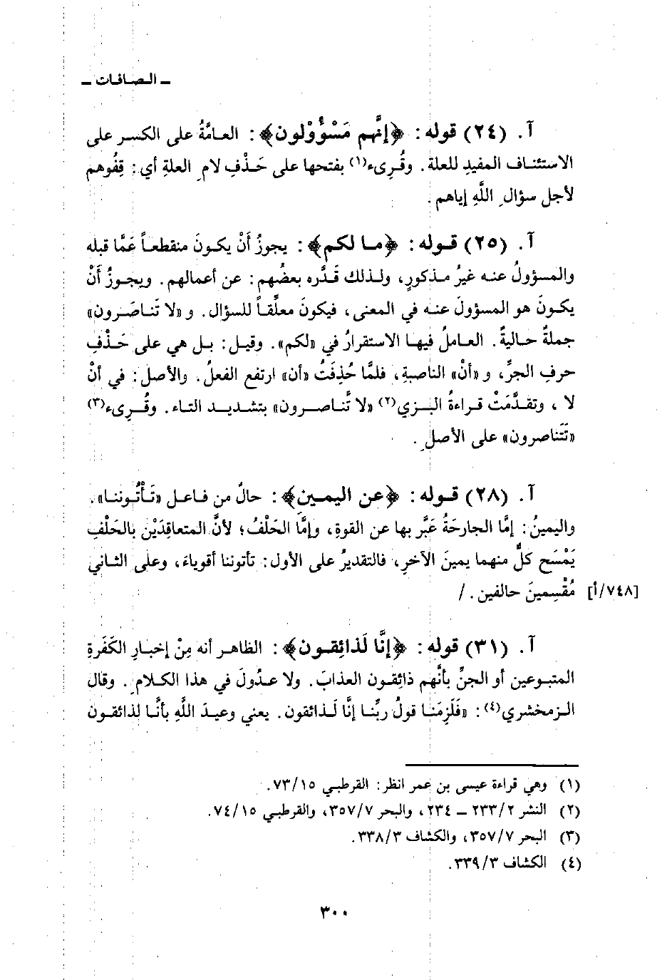 قوله: {إِنَّهُمْ مَّسْئُولُونَ} : العامَّةُ على الكسرِ على الاستئناف المفيدِ للعلة. وقُرِئ بفتحها على حَذْفِ لامِ العلةِ أي: قِفُوهم لأجل سؤال اللَّهِ إياهم.