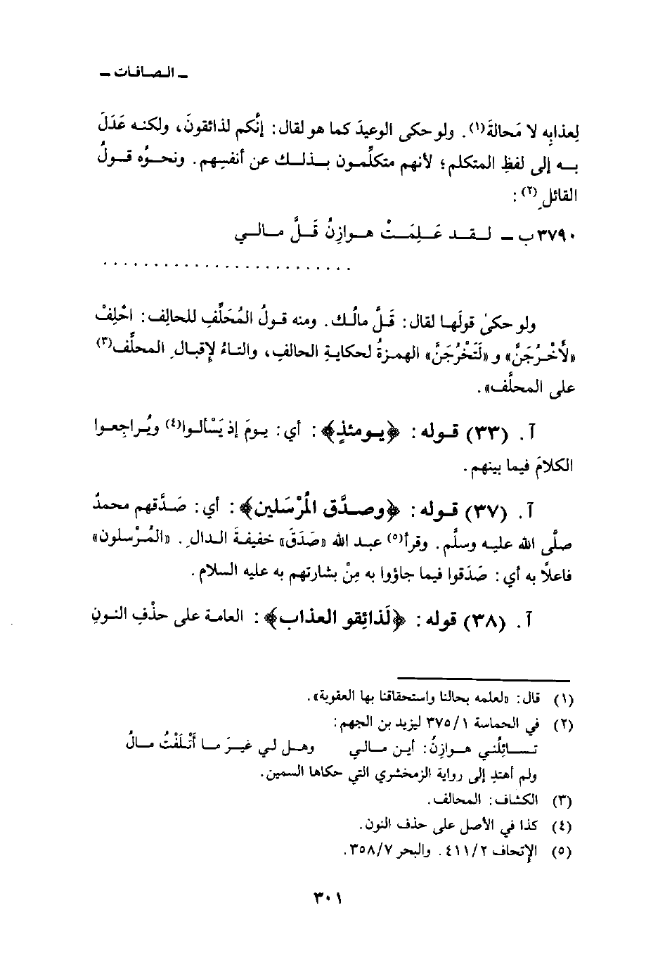 ولو حكى قولَها لقال: قَلَّ مالُك. ومنه قولُ المُحَلِّفِ للحالِف: احْلِفْ» لأَخْرُجَنَّ «و» لَتَخْرُجَنَّ «الهمزةُ لحكايةِ الحالفِ، والتاءُ لإِقبالِ المحلِّف على المحلَّف» .
