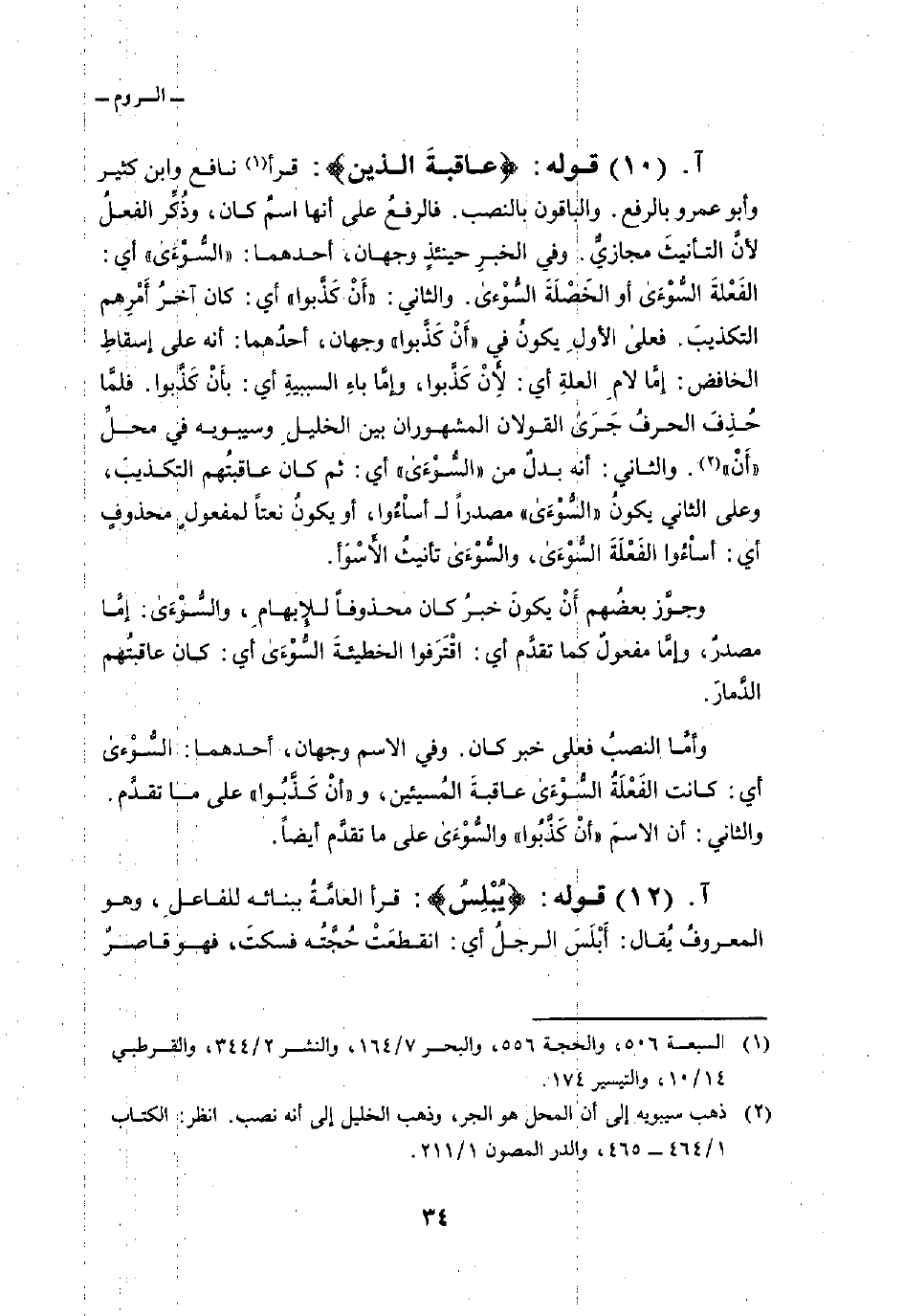 قوله: {عَاقِبَةَ الذين} : قرأ نافع وابن كثير وأبو عمرو بالرفع. والباقون بالنصب. فالرفعُ على أنها اسمُ كان، وذُكِّر الفعلُ لأنَّ التأنيثَ مجازيٌّ. وفي الخبرِ حينئذٍ وجهان، أحدهما: «السُّوْءَى» أي: الفَعْلَة السُّوْءَى أو الخَصْلَةَ السُّوْءى. والثاني: «أَنْ كَذَّبوا» أي: كان آخرُ أَمْرِهم التكذيبَ. فعلى الأولِ يكونُ في «أَنْ كَذَّبوا» وجهان: أحدُهما: أنه على إسقاطِ الخافض: إمَّا لامِ العلةِ أي: لأَنْ كَذَّبوا، وإمَّا باءِ السببيةِ أي: بأَنْ كَذَّبوا. فلمَّا حُذِفَ الحرفُ جَرَى القولان المشهوران بين الخليلِ وسيبويه في محلِّ «أَنْ» . والثاني: أنه بدلٌ من «السُّوْءَى» أي: ثم كان عاقبتُهم التكذيبَ، وعلى الثاني يكونُ «السُّوْءَى» مصدراً ل أساْءُوا، أو يكونُ نعتاً لمفعولٍ محذوفٍ أي: أساْءُوا الفَعْلَةَ السُّوْءَى، والسُّوْءَى تأنيثُ الأَسْوَأ.