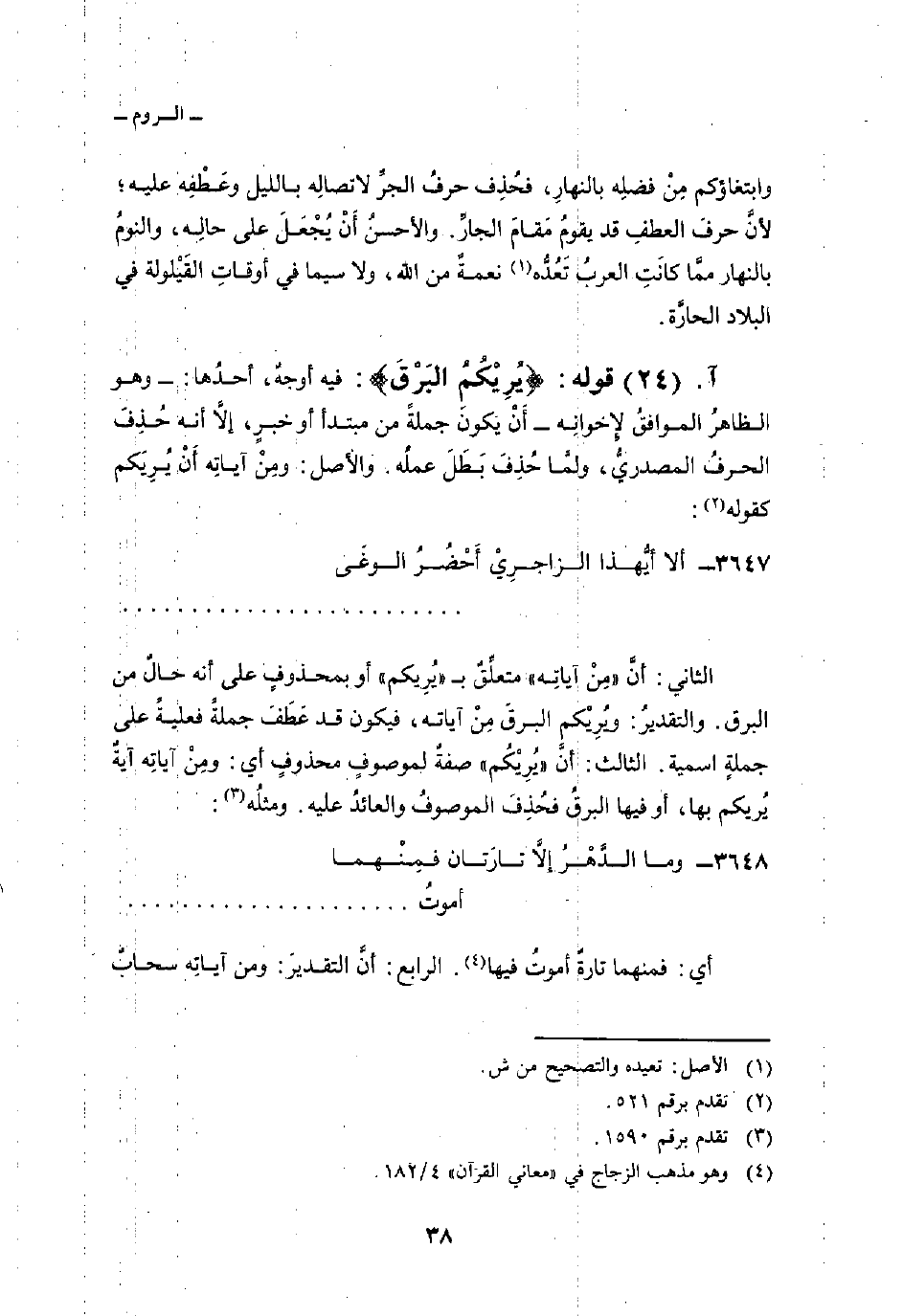 الثاني: أنَّ «مِنْ آياتِه» متعلِّقٌ ب «يُرِيكم» أو بمحذوفٍ على أنه حالٌ من البرق. والتقديرُ: ويُرِيْكم البرقَ مِنْ آياته، فيكون قد عَطَفَ جملةً فعليةً على جملةٍ اسمية. الثالث: أنَّ «يُرِيْكُم» صفةٌ لموصوفٍ محذوفٍ أي: ومِنْ آياتِه آيةٌ يُريكم بها، أو فيها البرقُ فحُذِفَ الموصوف والعائدُ عليه. ومثلُه: